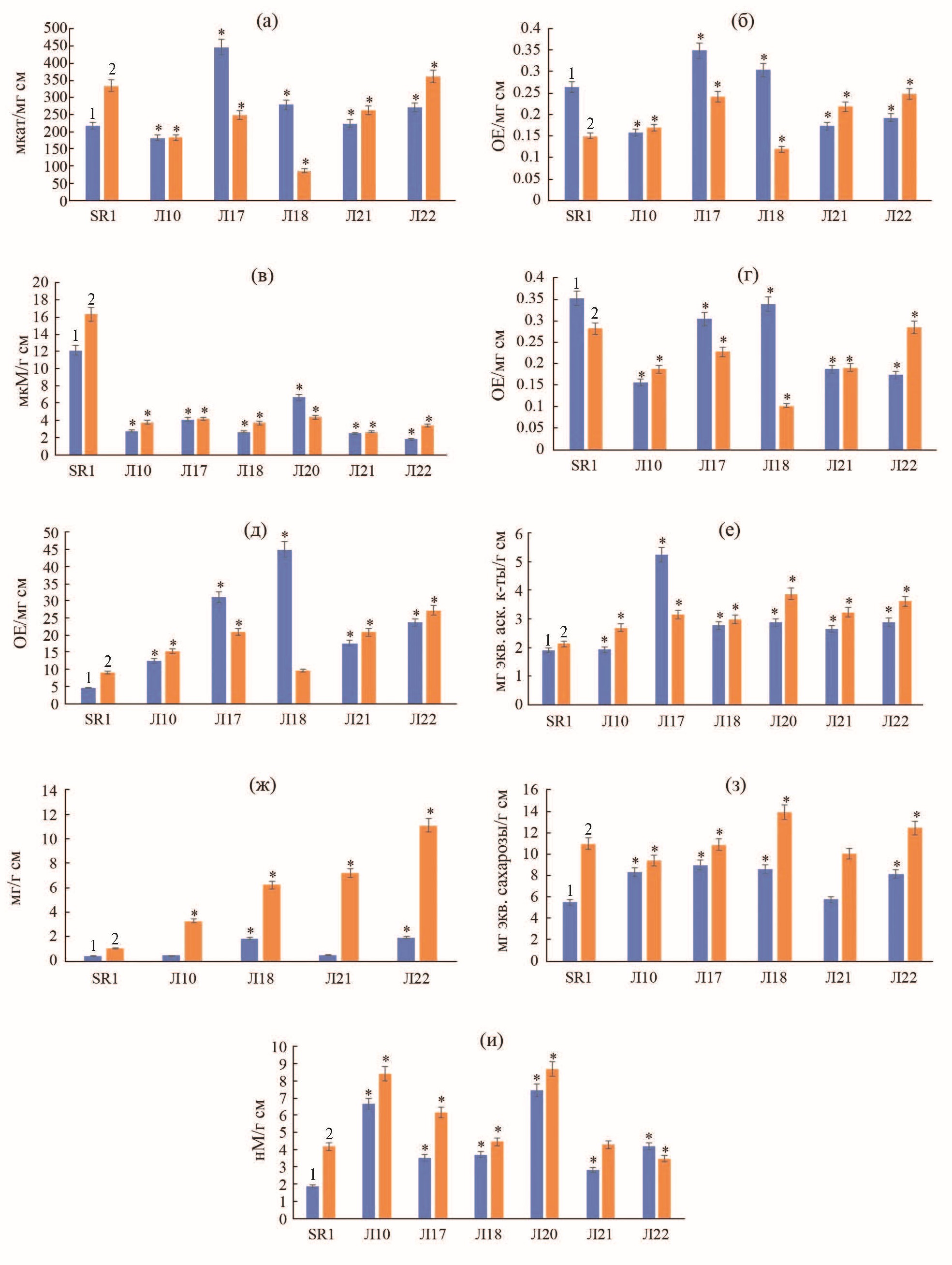 Рис. 5. Состояние антиоксидантной системы анализируемых ВК: (а) – активность каталазы, (б) – активность гваяколпероксидазы, (в) – содержание перекиси водорода, (г) – активность супероксиддисмутазы, (д) – активность глутатион-S-трансферазы, (е) – общая антиоксидантная способность, (ж) – содержание пролина, (з) – содержание водорастворимых сахаров, (и) – содержание малонового диальдегида. SR1 – контроль, Л10–Л22 – линии трансгенных ВК с геном TaNAC69, 1 – нормальные условия, 2 – при действии 150 мМ NaCl. Звездочки (*) указывают на достоверное различие данных между трансгенными и контрольной линиями ВК (P ≤ 0.05).