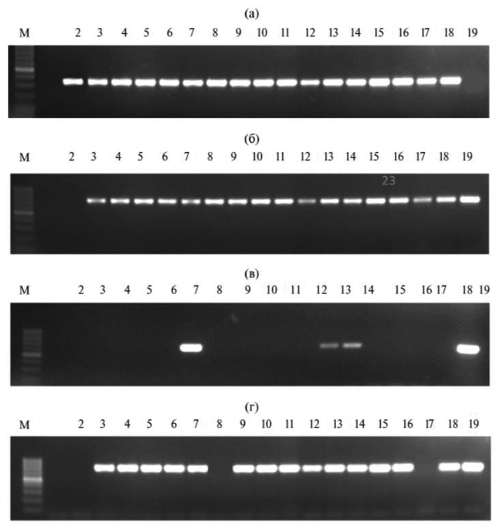 Рис. 2. ПЦР-амплификация генов Tom52 (а), nptII (б), VirB (в) и desC (г) на образцах геномной ДНК предполагаемых трансформантов и нетрансгенных растений томата. М – маркер молекулярной массы (GeneRuler 100 bp DNA Ladder, “Fermentas”, Литва); 2 – отрицательный контроль (линия ЯЛФ); 3–18 – независимые трансформированные линии томатов; 19 – положительный контроль (плазмида pVIG-DesC).