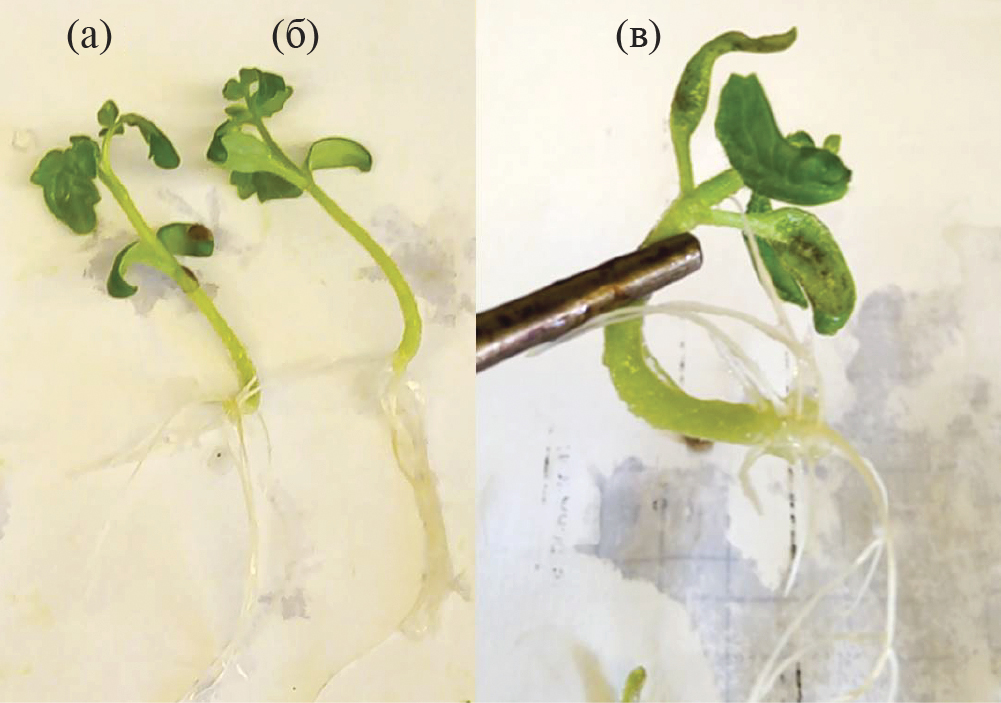 Фенотип большинства линий первичных трансформантов растений, выращенных на селективной среде, в основном, не отличался от растений контрольной линии, выращенных в условиях in vitro. У растений отмечена хорошо развитая мочковатая корневая система и развитый гипокотиль. Тем не менее, две линии трансгенных растений (50Chl и 8ER) характеризовались необычными фенотипами. У них выявлен сильно изогнутый гипокотиль с утолщением в нижней части (рис. 3).