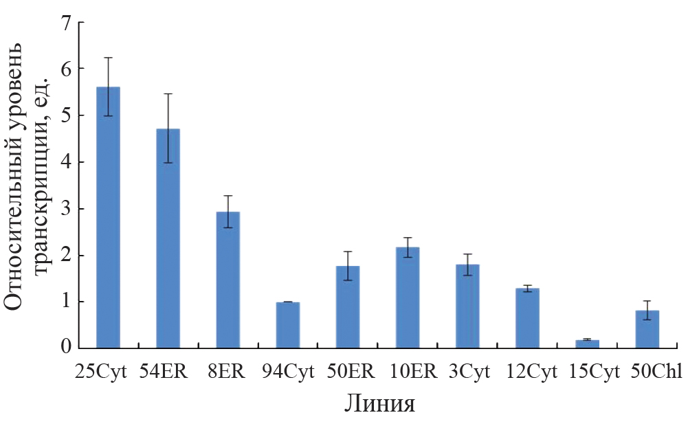 Для сравнительного анализа уровня транскрипции целевого гена desC в отобранных линиях использовали ПЦР-РВ метод. Было показано, что во всех линиях первичных трансформантов растений происходит транскрипция целевого гена, однако уровень транскрипции различается в широких пределах. Результаты представлены на рисунке 4. Было показано, что линии 25Cyt, 54ER, 8ER, характеризуются 3-, 4.5- и 5.5-кратным увеличением уровня мРНК целевого гена относительно линии сравнения, тогда как для линий 50ER, 10ER, 3Cyt, 12Cyt, 15Cyt, 50Chl этот показатель не превышает значения 2.17. В целом, различия в уровнях транскрипции desС могут быть обусловлены различием мест интеграции целевой последовательности в геном растения, поскольку при использовании метода агробактериальной трансформации интеграция Т-ДНК происходит случайным образом. Кроме того, различия в уровне транскрипции целевого гена можно также объяснить его различающейся дозой, поскольку анализ был проведен на Т1-трансгенных растениях, содержащих как гомозиготные, так и гемизиготные формы.