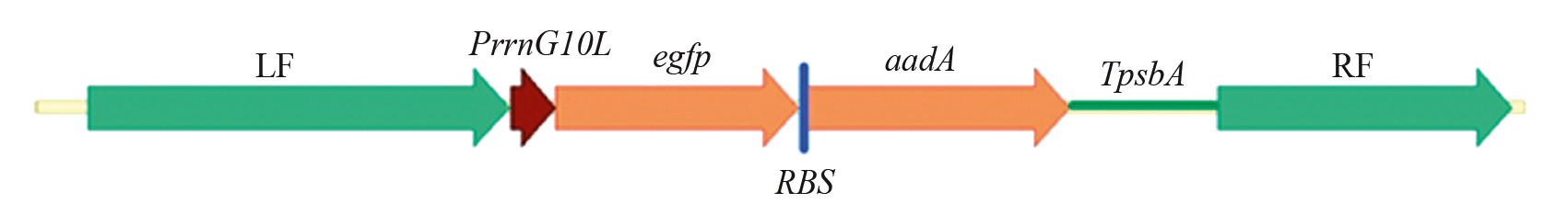 Для оценки уровня экспрессии и накопления рекомбинантного белка в модельных транспластомных растениях табака была создана генетическая конструкция pPlastEx-GFP, схема которой представлена на рис. 1. В состав конструкции входили репортерный ген egfp в качестве фенотипического маркера и целевого гена, а также селективный маркер aadA, обеспечивающий устойчивость к антибиотикам спектиномицину и стрептомицину, разделенные сайтом связывания рибосом.