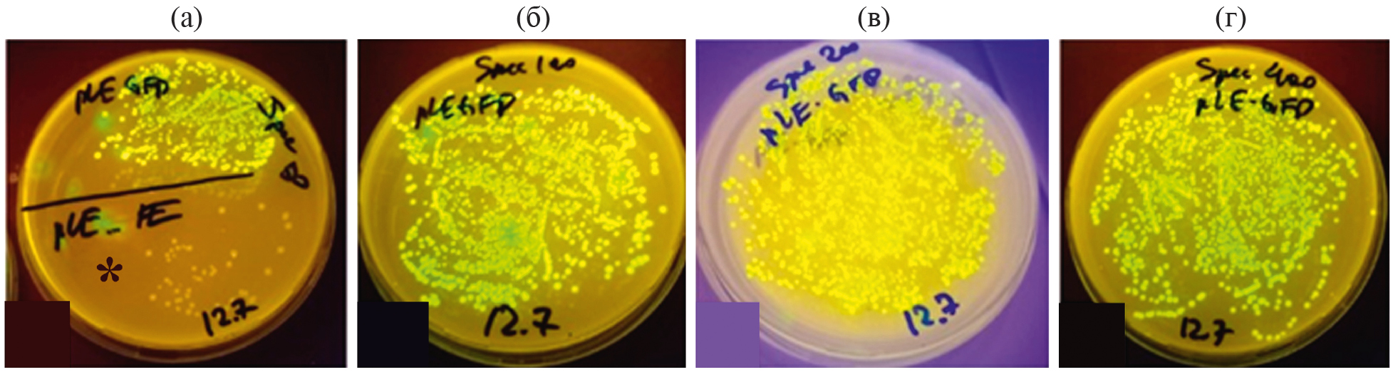 Рис. 2. Оценка экспрессионной активности генетической конструкции pPlastEx_GFP в клетках E. coli. а-г – клетки E. coli, трансформированные экспрессионным вектором, на питательной среде с различным содержанием спектиномицина. (а) – 50 мг/л; (б) – 100 мг/л; (в) – 200 мг/л; (г) – 400 мг/л. Зеленый цвет – флуоресценция eGFP. * – колонии не экспрессирующие egfp.