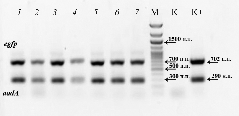 Рис. 3. Электрофореграмма продуктов амплификации в 1% агарозном геле (на примере 7 образцов), подтверждающая наличие генов aadA и egfp в геноме транспластомных растений. М – маркер молекулярных весов Step100 Long.