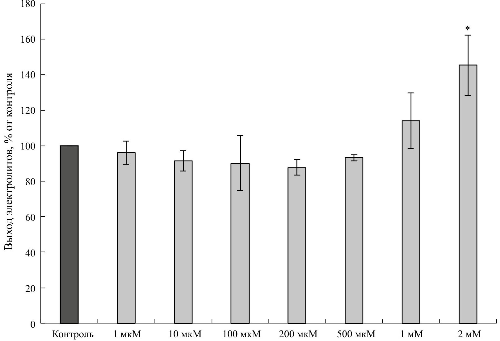 Рис. 1. Влияние различных концентраций Pb2+ на выход электролитов из тканей корнеплодов столовой свеклы в инкубационный раствор. Полный выход электролитов в контроле принят за 100%. Статистическую значимость отличий определяли по методу LSD Фишера. * – различия с контролем достоверны при P < 0.05.
