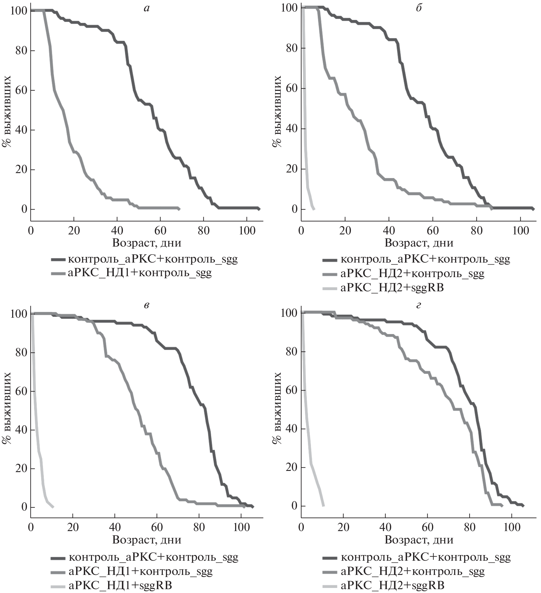 Гены shaggy и aPKC Drosophila melanogaster кодируют высококонсервативные протеинкиназы GSK3 (Glycogen Syntase Kinase 3) и aPKC (Protein Kinase C), играющие ключевую роль во многих клеточных процессах. Ранее мы продемонстрировали, что изменение экспрессии гена shaggy в нейронах влияет на продолжительность жизни. В настоящей статье показано, что изменение экспрессии гена aPKC в нейронах также влияет на продолжительность жизни. Изменение экспрессии двух протеинкиназ во всех нейронах самцов и самок и в мотонейронах самцов приводило к изменению продолжительности жизни, свидетельствующему об отсутствии влияния aPKC на GSK3 и возможном ингибирующем действии GSK3 на aPKC. В то же время изменение экспрессии двух протеинкиназ в мотонейронах самок приводило к изменению продолжительности жизни, свидетельствующему о существовании пока неясного механизма взаимодействия между этими белками. Выяснение механизмов взаимодействия между aPKC, GSK3 и другими их партнерами позволит углубить и расширить наши представления о причинах долголетия и способах продления жизни.