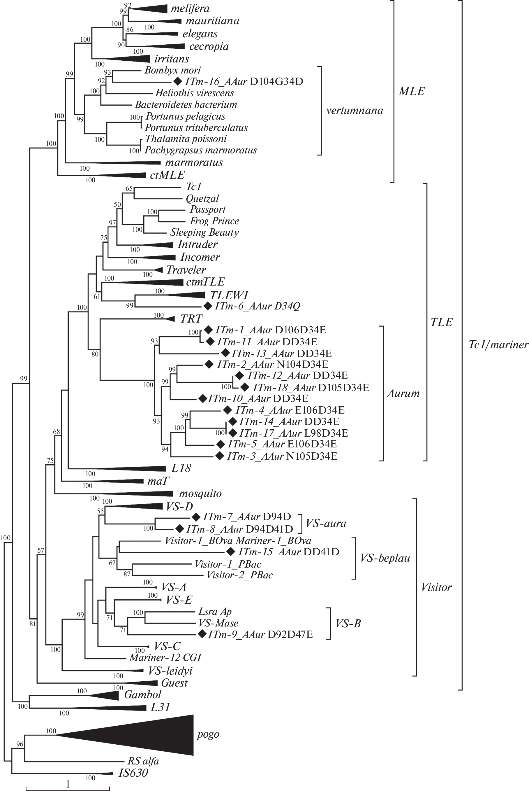 - Gomulski L.M., Torti C., Bonizzoni M. et al. A new basal subfamily of mariner elements in Ceratitis rosa and other tephritid flies // J. Mol. Evol. 2001. V. 53. № 6. P. 597–606. https://doi.org/10.1007/s002390010246