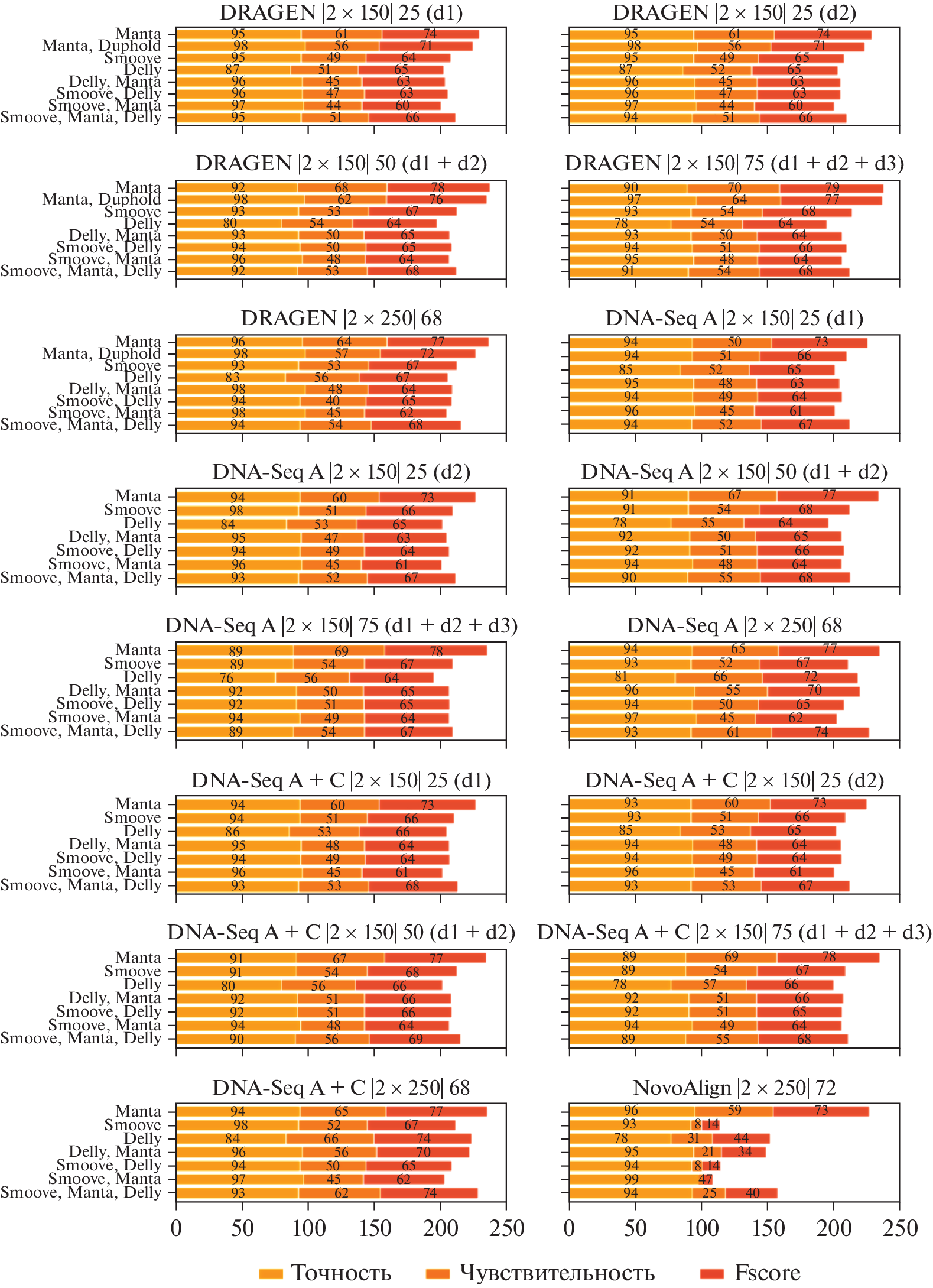 In this study three structural variant callers (Manta, Smoove, Delly) were analysed on the whole-genome sequencing data using four different alignment algorithms: DRAGEN, GDC DNA-Seq Alignment Workflow, GDC DNA-Seq Alignment Workflow + GDC DNA-Seq Co-Cleaning Workflow, NovoAlign, different lengths of raw reads: 2 × 150 bp and 2 × 250 bp, different mean genome coverage values. Results were compared to etalon results of GIAB team. Structural variants validation was hold also with Sanger sequencing. Structural variants deletions and insertions as it turned out were best determined with Manta tool. We’ve got 89–96% of accuracy and 59–70% of sensitivity for analysed deletions, and also 96–99% of accuracy and 15–36% of sensitivity for insertions. Smoove and Delly showed less accurate and sensitive results (Smoove: 91–95% of accuracy and 8–54% of sensitivity for deletions, Delly: 78–87% of accuracy and 31–66% of sensitivity for deletions, 99–100% of accuracy and 1–13% of sensitivity for insertions). Simultaneous using of two or even three structural variant callers didn’t give a rise of accuracy and sensitivity for deletions. Analysis showed that accuracy and sensitivity of structural variant callers rise with the rising of mean genome coverage value, increasing of reads length from 150 to 250 bp influence in to varying degrees on the accuracy and sensitivity of individual tools. Another inference of this study was that accuracy of structural variants callers vary depends on structural variants size range. For example, Manta finds better deletions in the range from 200 and more bp, Delly – from 1000 to 10 000 bp, Smoove – from 200 to 10 000 bp.