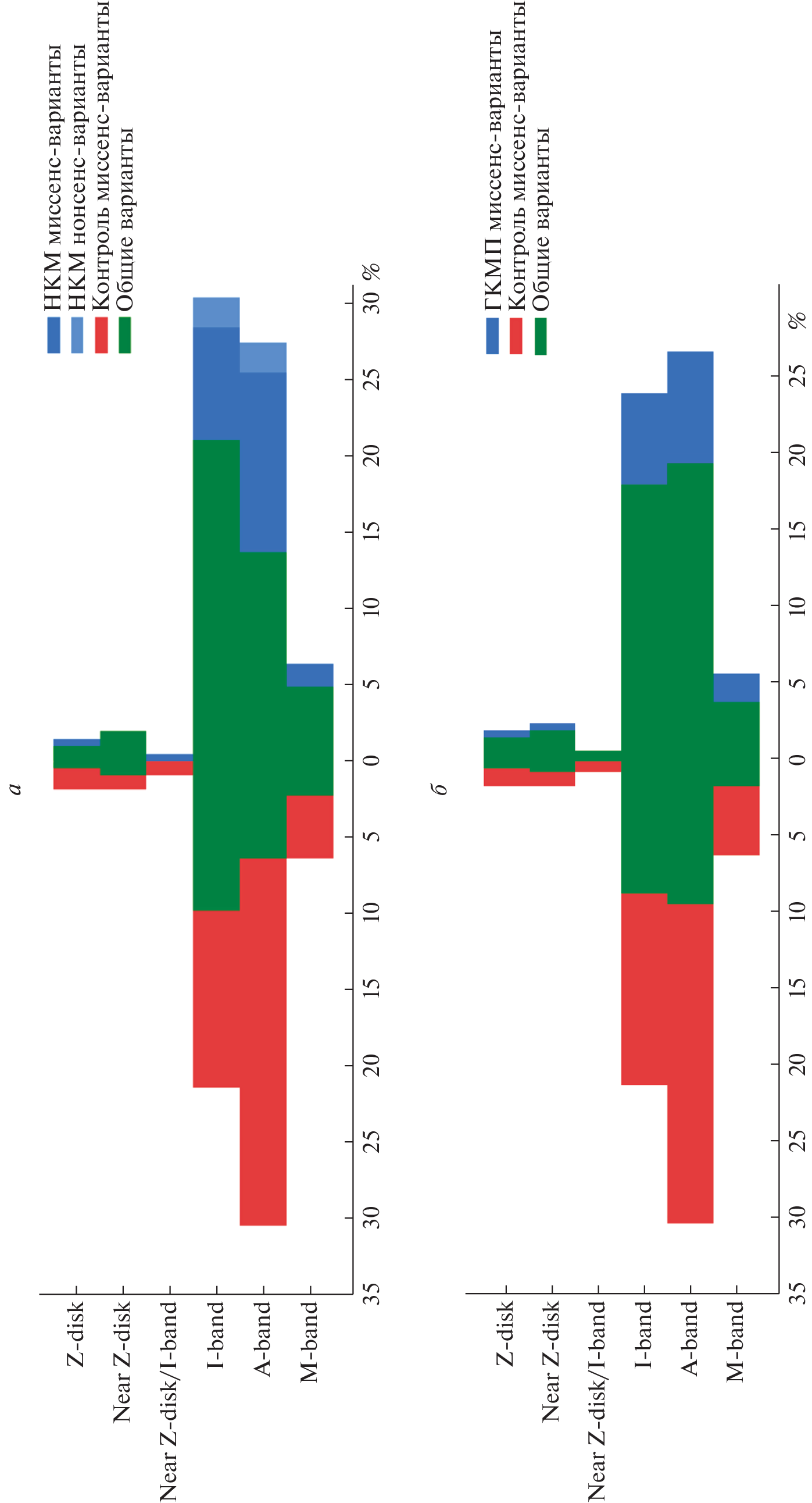 С использованием NGS секвенирована кодирующая последовательность гена TTN у пациентов с некомпактным миокардом левого желудочка (НКМ, 44 человека) и гипертрофической кардиомиопатией (ГКМП, 74 человека), а также в контрольной группе (194 человека) и выявлено девять нуклеотидных вариантов, приводящих к укороченному титину (TTNtv), и 372 миссенс-варианта. Проведен сравнительный анализ генетической изменчивости титина между группами пациентов с НКМ и ГКМП и контрольной выборкой по типу мутаций и их локализации в экзонах гена, а также в саркомерных и функциональных доменах белка. Подтверждена роль TTNtv в развитии НКМ, а также показана значимость дополнительных вариантов в этом же гене или в других генах, ассоциированных с различными кардиомиопатиями, для фенотипической реализации TTNtv. У 75% пациентов с TTNtv наблюдался дилатационный фенотип НКМ. Миссенс-замены в гене TTN обнаружены как среди пациентов с НКМ и ГКМП, так и у людей в контрольной выборке, что косвенно подтверждает доброкачественность большинства миссенс-вариантов в этом гене. В работе определены и перечислены экзоны гена TTN с нуклеотидными заменами и без них, а также представлен перечень миссенс-вариантов с возможной клинической значимостью в отношении структурной патологии миокарда, включая новые. Показано, что большинство патогенных и потенциально значимых вариантов находились в А-зоне саркомера. Во всех группах выявлено порядка 30–50% новых, ранее не описанных вариантов. Вероятно, многие из них являются нейтральными и представляют исключительно популяционный интерес.