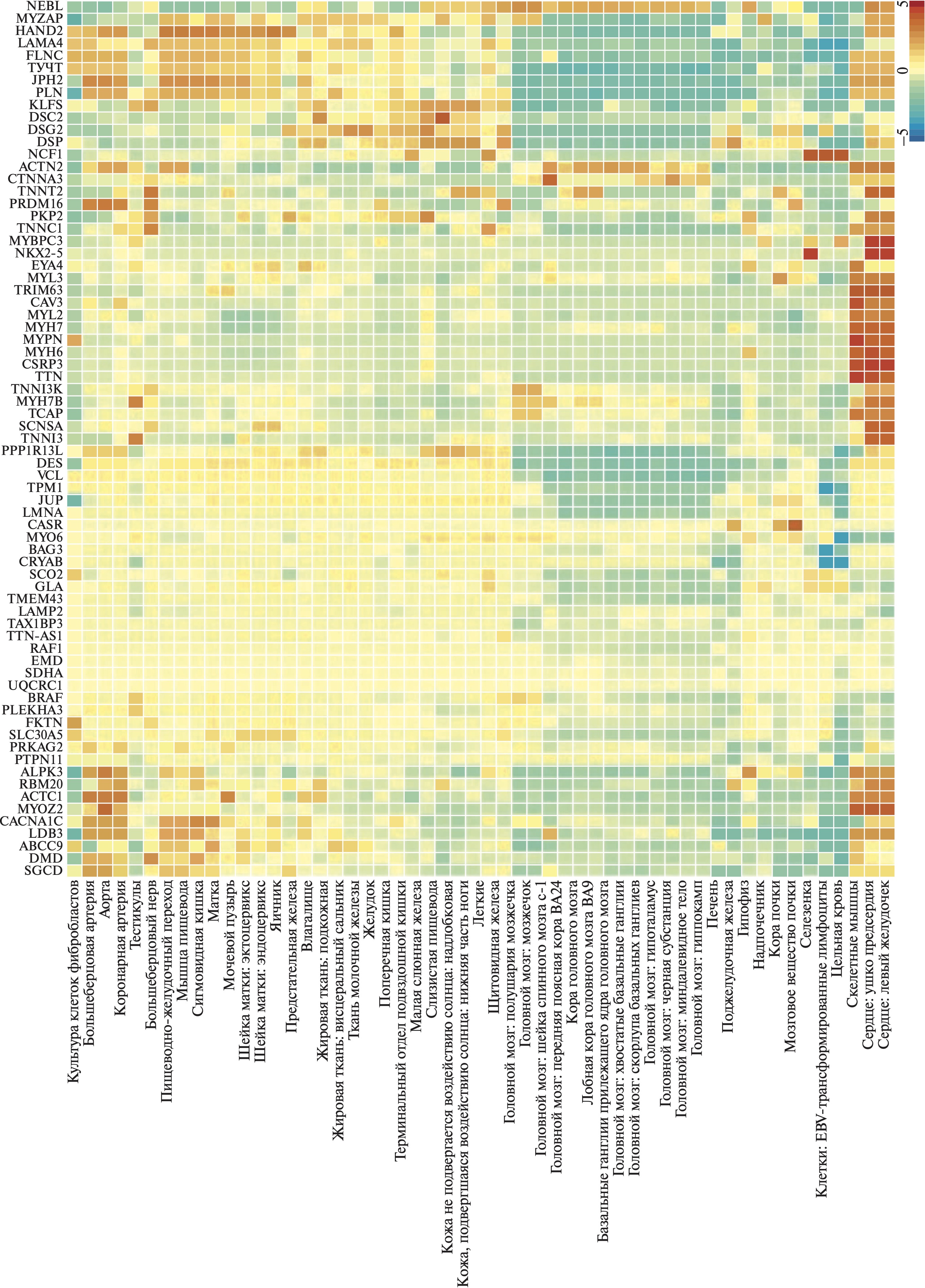 Согласно GTEx Consortium привлеченные к рассмотрению гены КМП экспрессируются в 54 тканях [27], но, как правило, на невысоком уровне, даже в миокарде и скелетных мышцах (рис. 1). На относительно высоком уровне экспрессия в сердце наблюдается для генов MYBPC3, NKX2-5, MYH6, CSRP3 и некоторых других. Среди генов КМП есть и гены с низким уровнем экспрессии (например, гены KLF5, MYO6, BRAF и др.). С другой стороны, гены NEBL и ACTN2 на уровне выше средних значений экспрессируются в различных отделах головного мозга, а HAND2, LAMA4, CACNA1C – в тканях артерий и различных отделов кишечника и т.д.