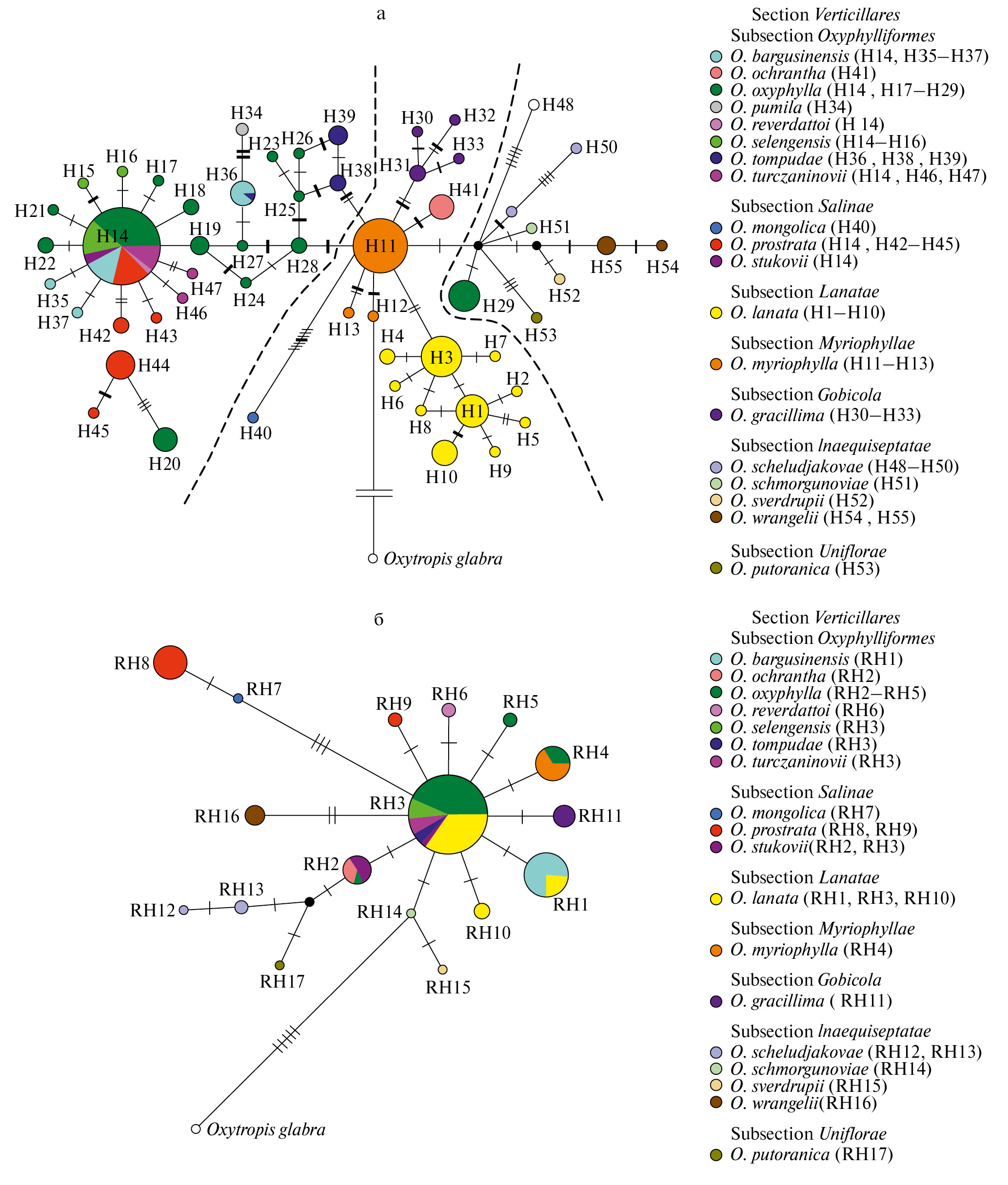 В генеалогической сети риботипов (рис. 2,б), как и в сети хлоротипов, наблюдается “звездчатая” структура – свидетельство общей экспансии, в центре которой находится риботип RH3 с 11-ю мутационными связями. Это доминантный и потенциальный предковый риботип общий для 6 южно-сибирских таксонов, включая O. lanata, хлоротипы которого хорошо дивергированы от хлоротипов других видов гаплогруппы II (рис. 2,а). Такое “звездчатое” расположение риботипов, как было сказано ранее, обусловлено общим происхождением видов секции Verticillares, их относительно недавней дивергенцией, сохранением анцестрального полиморфизма и неполным расхождением филетических линий, а также гибридизацией между таксонами со слабыми репродуктивными барьерами в зоне симпатрии. Кроме того, “звездчатая” структура может указывать на быструю адаптивную радиацию входящих в нее таксонов. Ранее на основе ядерных и хлоропластных маркеров было установлено, что быстрая радиация характерна для рода Oxytropis [4], как и других родов сем. Fabaceae: Lupinus [58], Astragalus [59], Sophora [60], Indigofera [61] и др. Наличие общего риботипа также было показано нами для шести видов Oxytropis, относящихся к трем разным подродам Phacoxytropis, Tragacanthoxytropis и Oxytropis рода Oxytropis [26]. Риботипы арктических видов обособлены и не имеют общих риботипов с южно-сибирскими видами, что указывает на их относительно раннюю дивергенцию от этой группы.