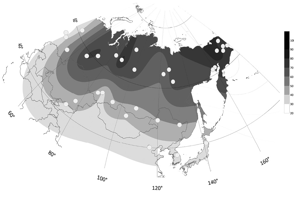 Анализ межпопуляционной генетической дифференциации (в виде Fst-значений) показал, что по распределению аллелей локуса rs174570 популяции северной части Сибири (эскимосы, чукчи, коряки, эвены, эвенки, якуты) статистически значимо отличаются от популяций Южной Сибири (буряты, алтайцы, шорцы, тувинцы) (табл. 1 доп. материалов). Результаты пространственной интерполяции значений частоты аллеля rs174570-T в популяциях Северной Евразии также показали, что частота этого варианта гена FADS2 постепенно повышается к северу, достигая максимальных значений у коренного населения Чукотки (рис. 1; табл. 2 доп. материалов).