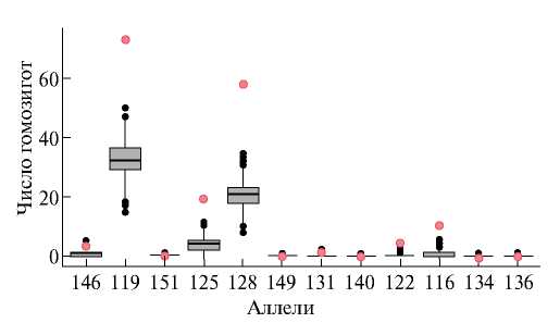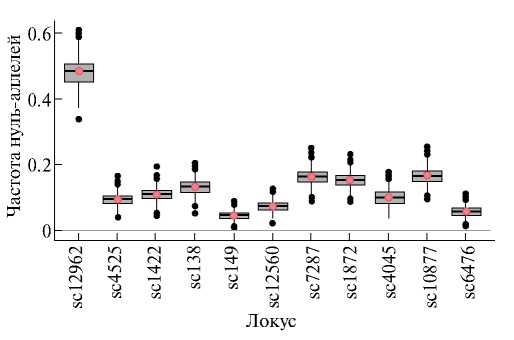 На выборке D. raddei для шести тринуклеотидных и пяти динуклеотидных локусов были получены генетические характеристики, такие как число аллелей и генотипов, наблюдаемая и ожидаемая гетерозиготность, а также выравненность (степень равномерности распределения генотипов) и индекс Симпсона (табл. 1). В качестве внешней группы была использована небольшая выборка особей вида D. valentini. Было обнаружено, что наименьшим числом аллелей и генотипов характеризуется локус sc12962, а также для этого локуса характерно наибольшее отклонение наблюдаемой гетерозиготности от ожидаемой. Это связано с неравномерным распределением аллелей в популяциях (рис. 1) и значительным количеством гомозигот по аллелям “119” и “128” (названия аллелей соответствуют размерам в парах нуклеотидов, полученных при анализе длин амплифицированных фрагментов – фрагментом анализе). Отклонения значений наблюдаемой и ожидаемой гетерозиготности были выявлены по всем проанализированным локусам, в связи с этим мы предположили наличие нуль-аллелей по каждому локусу (рис. 2). Как видно из рис. 2, наиболее вероятно присутствие подобных аллелей в случае локуса sc12962. Так как изучаемые локусы характеризуются высоким уровнем полиморфизма и поскольку данные виды относятся к одному роду кавказских скальных ящериц, была проведена оценка совпадающих аллельных вариантов у проанализированных особей D. raddei (оба подвида) и D. valentini (табл. П3). Согласно полученным результатам, наибольшее число совпадающих аллелей между разными видами было выявлено по локусу sc12962. На основании полученных данных мы исключили локус sc12962 из дальнейшего анализа, и таким образом оценка внутривидового разнообразия D. raddei проводилась на основании полиморфизма десяти микросателлитных локусов.