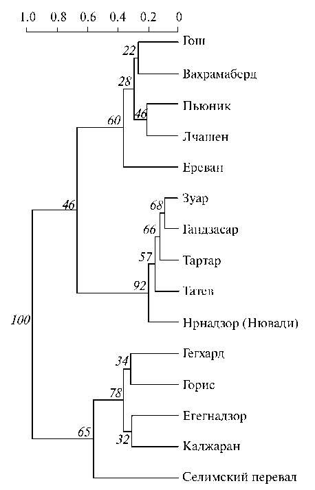 Рис. 3. Неукорененное филогенетическое дерево популяций D. raddei, построенное на основании генетических расстояний по Нею с бутстреп-поддержкой в 100 итераций.
