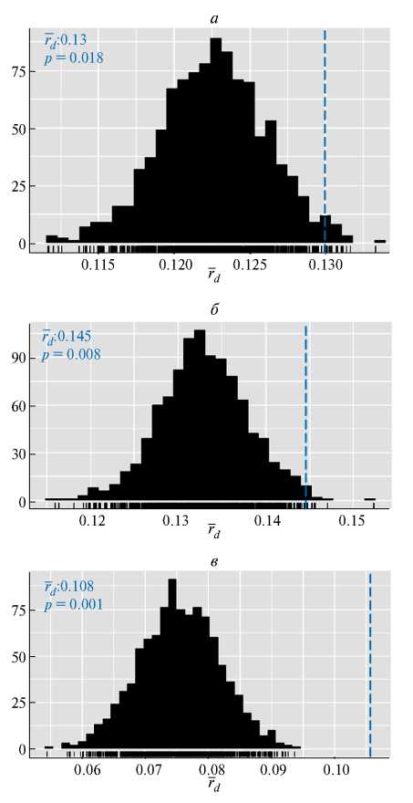 Рис. 4. Индекс ассоциации () подвидов D. raddei. а – без разделения на подвиды; б – D. r. raddei; в – D. r. nairensis.