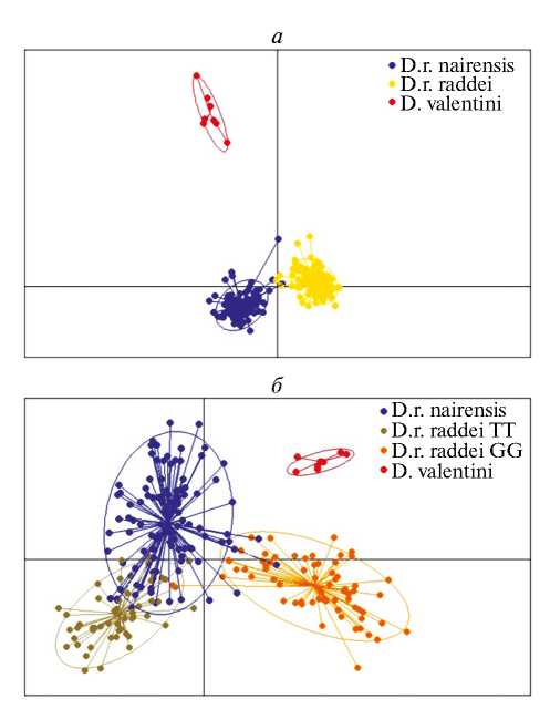 Использование метода дискриминантного анализа главных компонент (DAPC) на всей выборке вида D. raddei и внешней группе D. valentini позволило определить наличие трех генетических кластеров (K = 3), соответствующих виду D. valentini (красный цвет) и подвидам D. r. raddei (желтый цвет) и D. r. nairensis (синий цвет) (рис. 6,а). При разделении подвида D. r. raddei на две группы GG и TT и соответственно увеличении числа кластеров (К = 4) популяции вида D. raddei образуют три незначительно перекрывающиеся облака, соответствующих группам популяций D. r. raddei GG, D. r. raddei TT и D. r. nairensis (рис. 6,б).