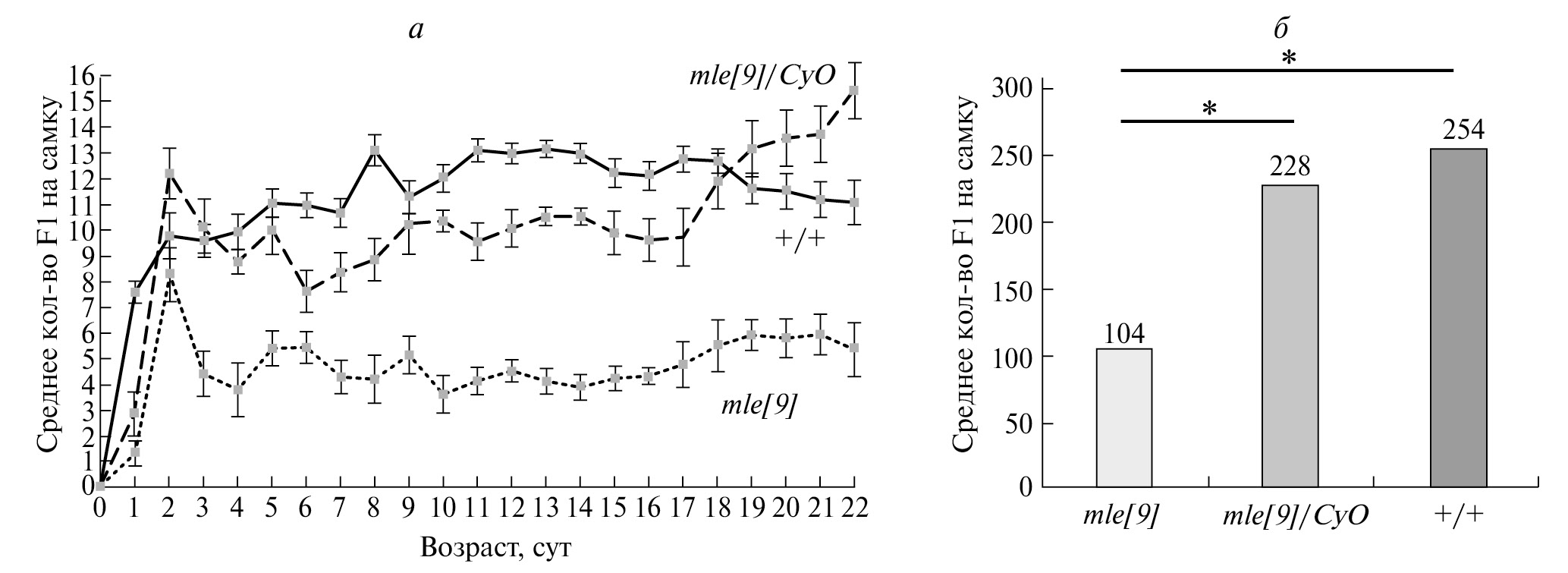 Рис. 5. Мутация mle[9] в гомозиготном состоянии снижает фертильность самок. а – динамика фертильности самок на протяжении первых трех недель жизни. mle[9] – гомозиготные самки, mle[9]/CyO – гетерозиготные самки, +/+ – самки линии Oregon R. Планки погрешностей обозначают стандартную ошибку среднего; б – среднее количество потомков за первые 22 сут жизни, * – p < 0.001.