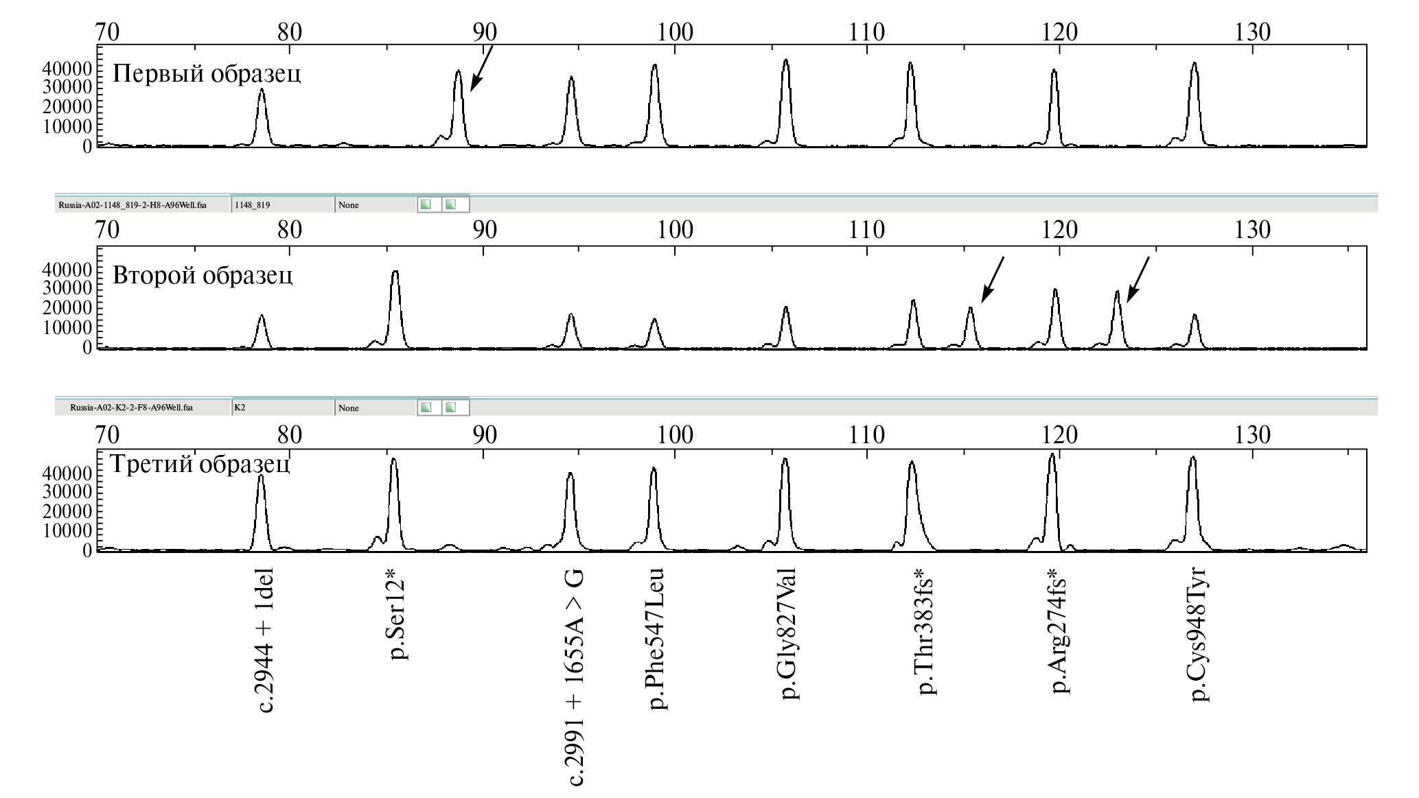 Рис. 2. Визуализация результатов фрагментарного анализа ПЦР-продуктов MLPA-систем детекции частых вариантов в генах CNGB3, CRB1, CNGA3, CEP290, GUCY2D и PDE6H. Первый образец: в гене PDE6H обнаружен вариант p.Ser12* в гомо-/гемизиготном состоянии; второй образец: в гене CNGB3 обнаружены варианты p.Thr383Ilefs*13 и p.Arg274Valfs*13 в гетерозиготном состоянии; третий образец – норма.