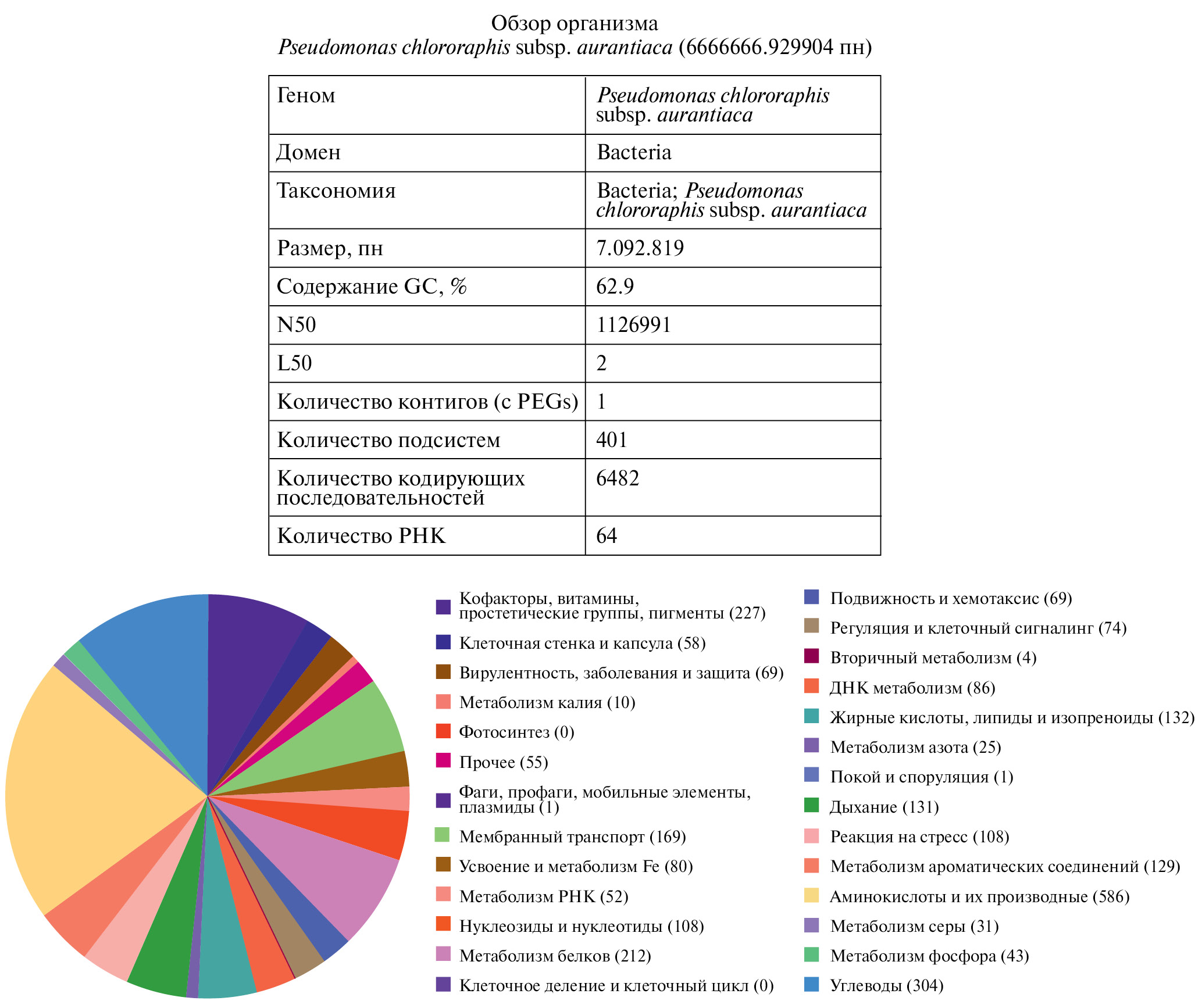 Установлено, что размер генома мутантного штамма B-162/2 бактерий P. chlororaphis subsp. aurantiaca составляет 7129212 пн. Аннотация, выполненная с помощью алгоритма RASTtk, обнаружила 6482 кодирующие последовательности и 64 последовательности, кодирующие тРНК и рРНК (рис. 3). Содержание ГЦ-пар в геноме составило 62.9%, что соответствует таковому для представителей рода Pseudomonas [14]. Большинство генов (586) в геноме штамма B-162/2 кодируют аминокислоты и их производные, продукты 304 генов участвуют в метаболизме углеводов, 227 генов задействованы в метаболизме кофакторов, витаминов и пигментов (рис. 3).