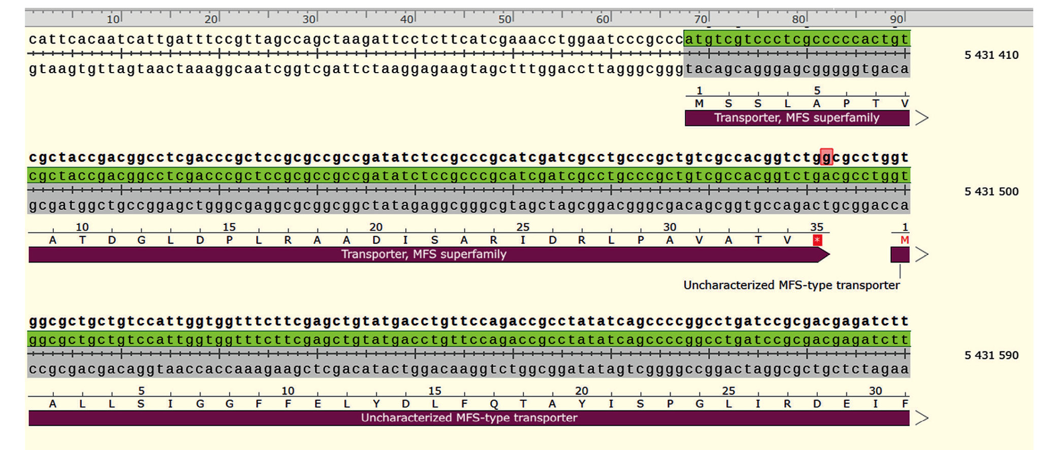 Рис. 4. Строение геномной области, кодирующей транспортер MFS-типа у бактерий штамма В-162/2. Зеленым цветом выделена кодирующая последовательность белка MFS-транспортера из бактерий мутантного штамма B-162/2, сверху геном бактерий штамма дикого типа B-162. Стоп-кодон (tga) обозначен звездочкой, выше него выделен гуанин (координата радикальной мутации: g®a). Красная буква “М” – это аминокислота метионин, обозначающая начало новой ОРС.