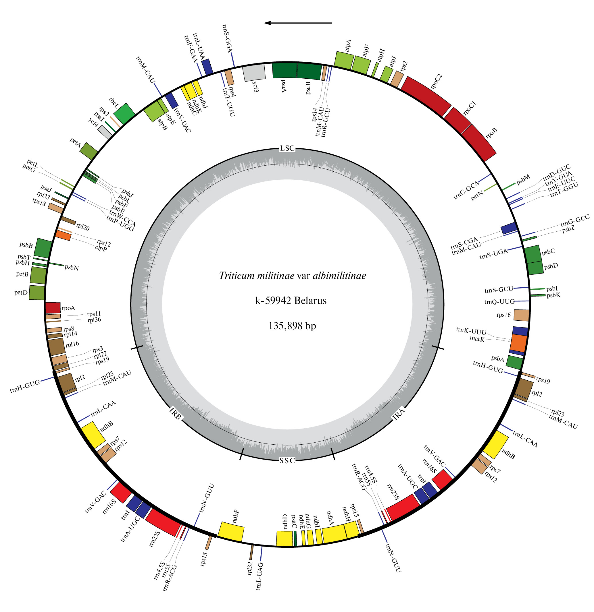 У пшеницы Милитины было аннотировано 132 структурных гена, из которых 85 белок-кодирующих, 31 ген тРНК и четыре гена рРНК. Семь генов, кодирующих белки (rps19, rpl2, rpl23, ndhB, rps7, rps12, rps15), восемь генов тРНК (trnH-GUG, trnM-CAU, trnL-CAA, trnV-GAC, trnT-CGU, trnA-UGC, trnR-ACG, trnN-GUU), четыре гена рРНК (rRNA4.5, rRNA23, rRNA16 и rRNA5) были дублированы из-за того, что находятся в области повтора IR. При этом в SSC-области обнаружено девять белок-кодирующих генов и один ген тРНК, в LSC-области – 69 белок-кодирующих генов и 22 гена тРНК. Кроме того, из 132 генов 14 имеют по одному интрону (trnK-UUU, rps16, trnS-CGA, atpF, trnV-UAC, petB, petD, rpl16, rpl2, ndhB, trnI-GAU, trnA-UGC, ndhA, trnL-UAA) и один ген (ycf3) – два интрона. Самый крупный интрон (2558 пн) находится в гене trnK-UUU, внутри которого располагается другой ген – matK. Также в хлоропластном геноме T. militinae присутствует транс-сплайсируемый ген rps12. Все полученные результаты представлены на рис. 1 в виде кольцевой структуры, полученной при помощи программы OGDRAW. Различные цветовые блоки отображают принадлежность генов к тем или иным функциональным группам.