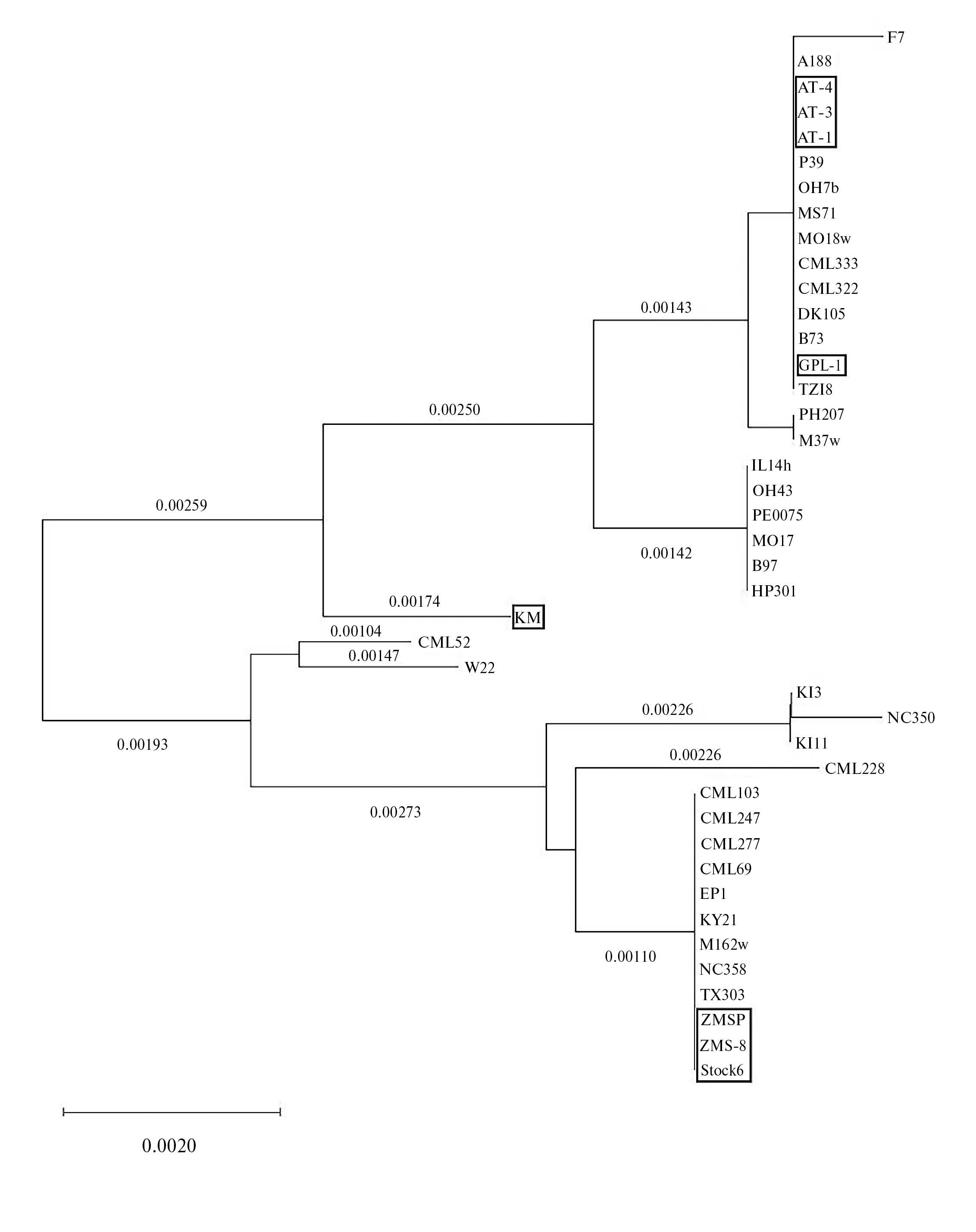 Рис. 4. Филограмма линий кукурузы по гену Zm_DMP7, построенная в программе MEGA 11 [по 16] (обозначения линий даны согласно авторскому оригиналу). Вариант представления с данными эволюционного расстояния для каждой из ветвей; рамками выделены изучаемые линии саратовской селекции.