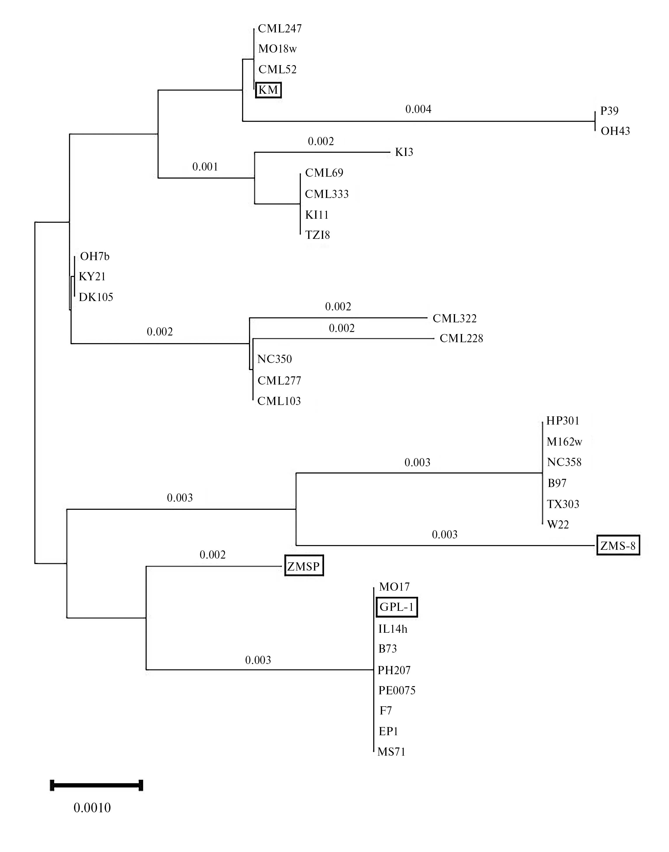 Рис. 3. Филограмма линий кукурузы по гену Zm_Pla1, построенная в программе MEGA 11 [по 16] (обозначения линий даны согласно авторскому оригиналу). Вариант представления с данными эволюционного расстояния для каждой из ветвей; рамками выделены изучаемые линии саратовской селекции.