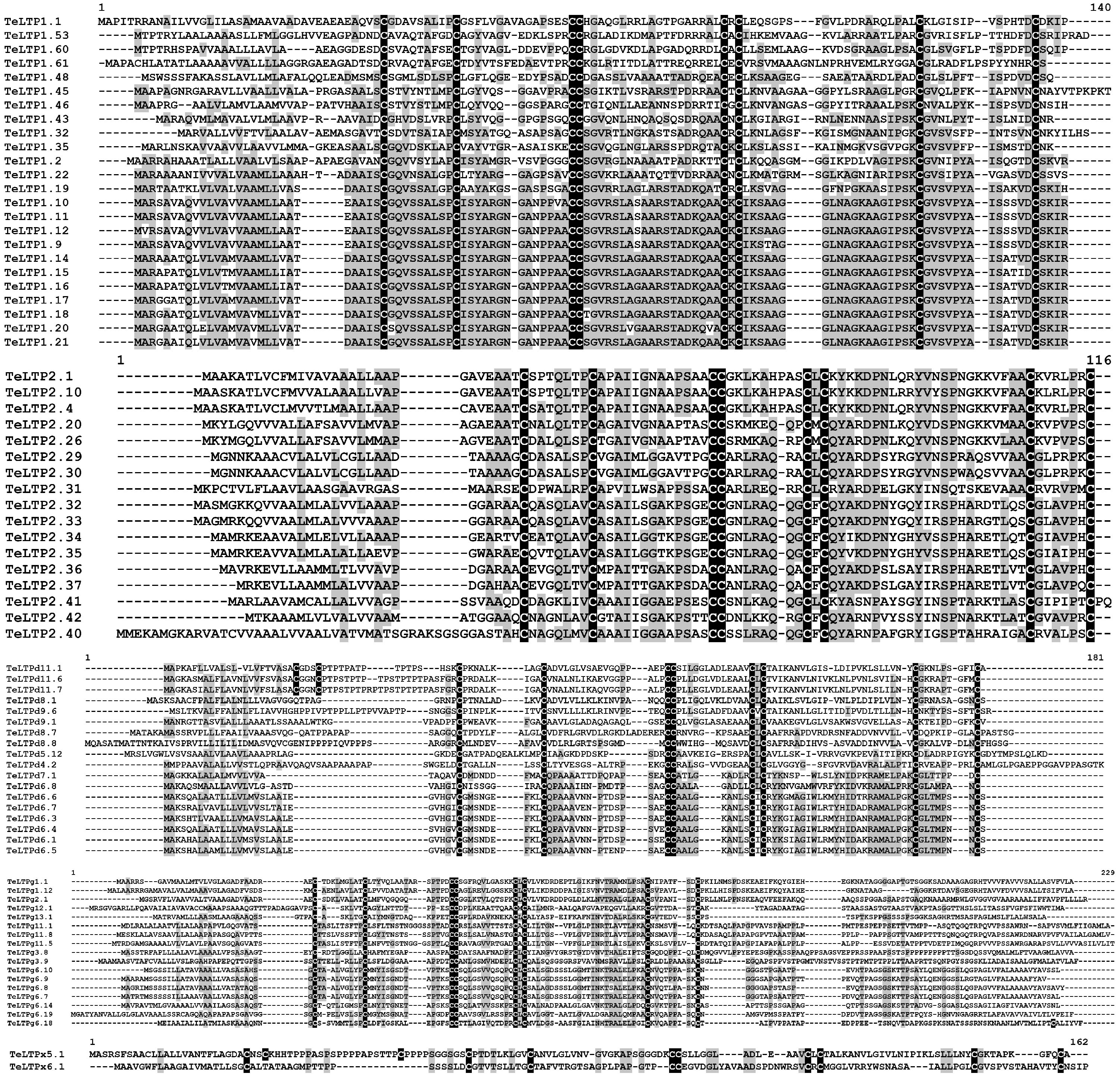 Рис. 3. Выравнивание аминокислотных последовательностей липид-переносящих белков Th. elongatum. Консервативные аминокислотные остатки выделены серым цветом. Остатки цистеина в зрелом пептиде выделены белым цветом на черном фоне. Типы сходных пептидов разделены пустой строкой.