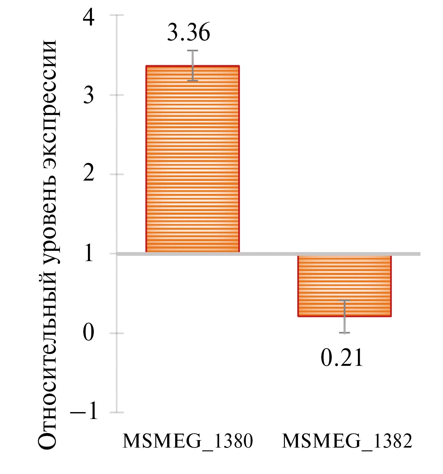 Выделение РНК и измерение уровня экспрессии гена MSMEG_1380 и MSMEG_1382 с использованием РТ-ПЦР проводили по описанной ранее методологии без модификаций [9]. Метод оценки экспрессии (ΔΔCt), p-value ≤ 0.001. Используемая последовательность праймеров: