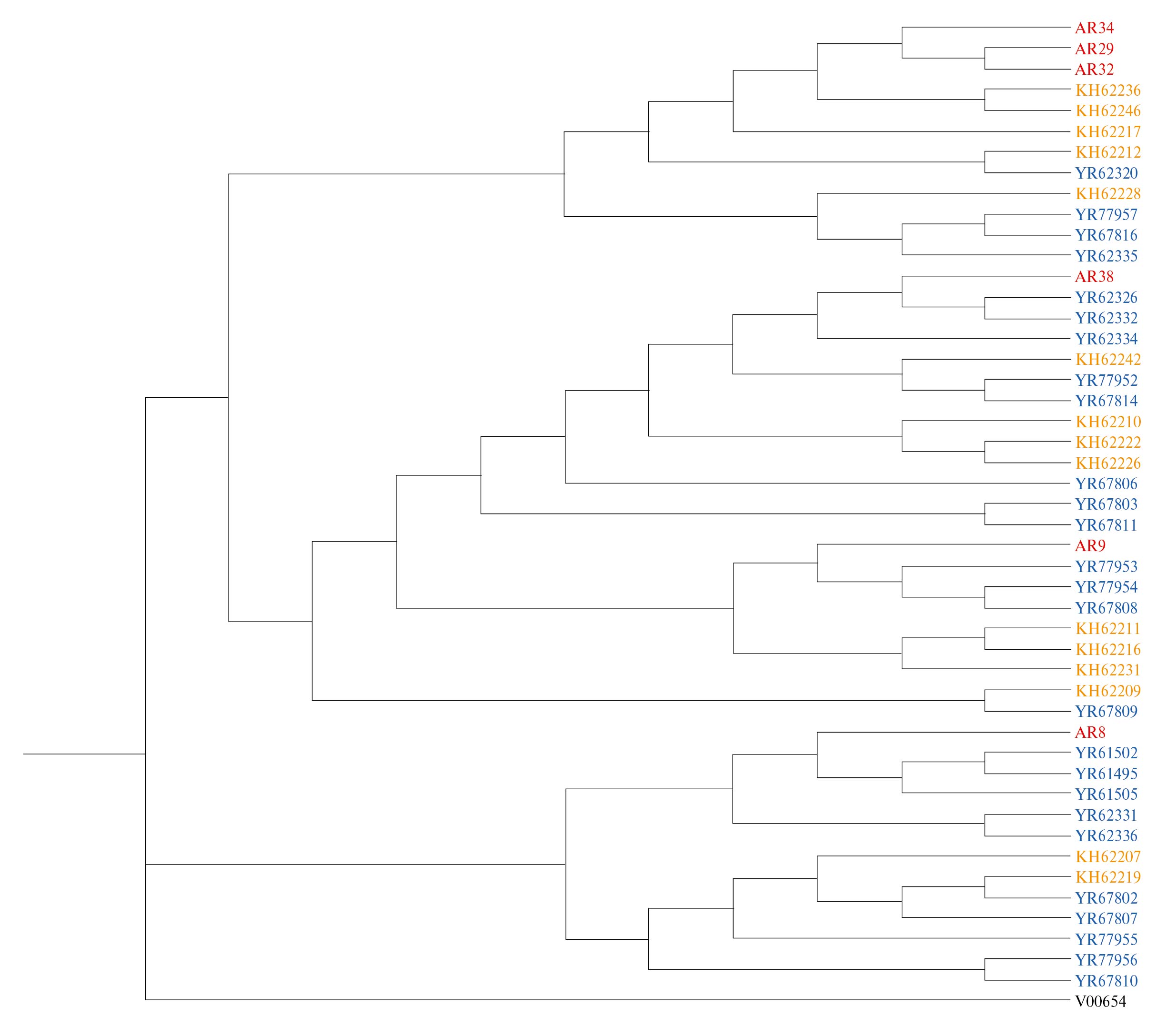 Поскольку у археологических образцов нуклеотидная последовательность была определена фрагментарно, дополнительно была исследована область D-петли как наиболее полиморфная часть митохондриального генома. Построена дендрограмма генетических дистанций для археологических образцов (AR) по отношению к современным представителям ярославской (YR) и холмогорской (KH) пород (рис. 2).