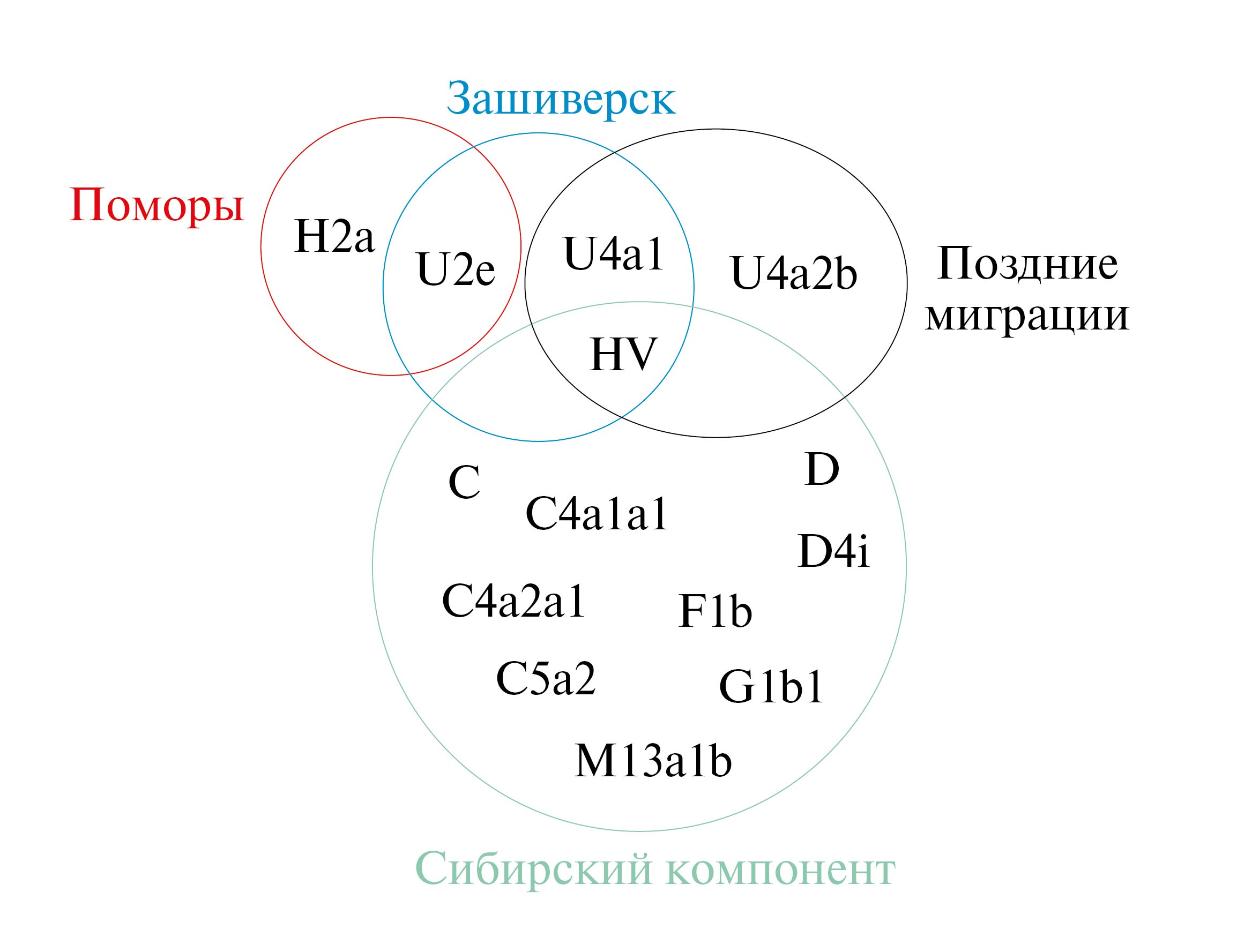 Рис. 3. Связь происхождения митохондриальных гаплогрупп русскоустьинцев с основными волнами заселения с. Русское Устье по данным генеалогии материнских родов. Поморы: с выходцами из Поморья могут быть связаны суб- гаплогруппы H2a и U2e. Сибирский компонент: C, C4a1a1, C4a2a1, C5a2, D, D4i, F1b, G1b1 и M13a1b. Поздние миграции: по результатам генеалогии материнских родов из западно-евразийских линий, однозначно только суб-гаплогруппа U4a2b была связана с поздними миграциями (период СССР), не исключено, что с поздними миграциями также могут быть связаны линии HV и U4a1. Зашиверск: суб-гаплогруппы HV, U2e и U4a1 могли быть привнесены на арктическое побережье Якутии как вместе с русскоязычным населением упраздненного г. Зашиверск, так и в последующие исторические периоды. Суб-гаплогруппа HV может быть связана не только с русскоязычным населением, но и с местным автохтонным компонентом, поскольку ранее была обнаружена в популяциях Восточной Сибири [43, 44, 69].