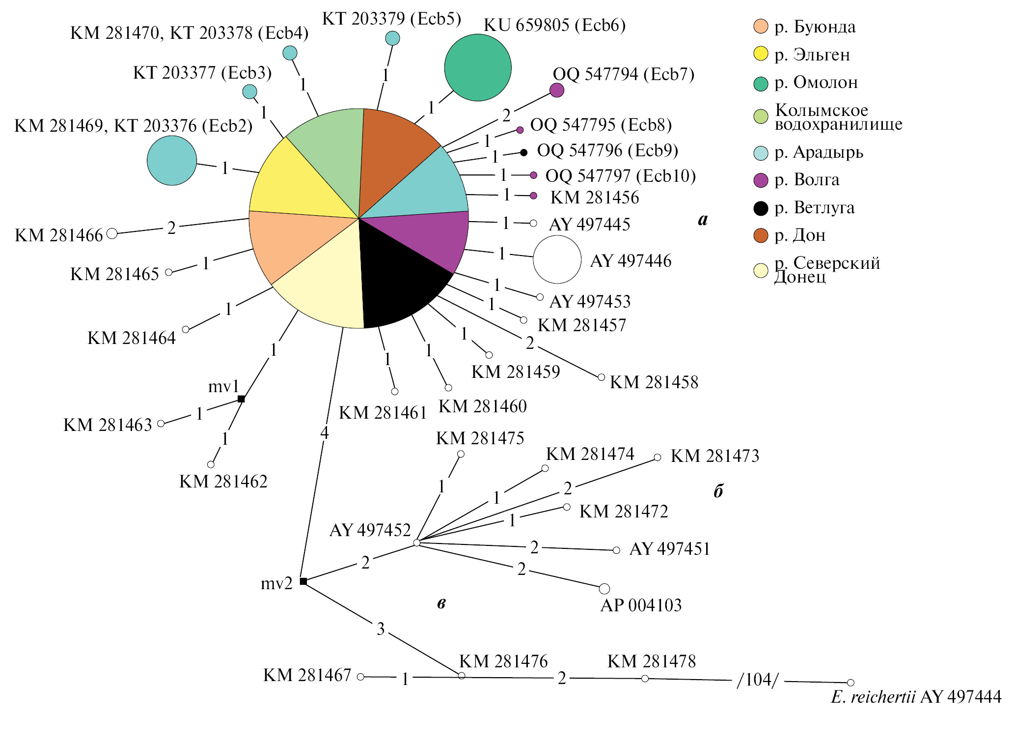 Рис. 3. Медианная сеть гаплотипов гена цитохрома b обыкновенной щуки из некоторых рек России и варианты, представленные в GenBank. На ветвях сети цифрами обозначено число мутаций; mv – медианный вектор. Размеры кружков соответствуют количеству гаплотипов. А, Б, В – филогенетические линии.