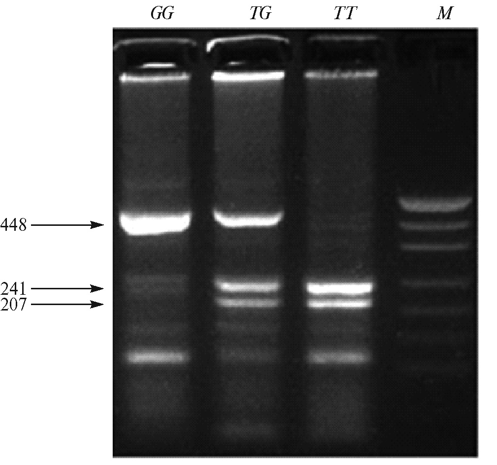 По результатам ПЦР-ПДРФ анализа для гена TLR2 выявлено два аллеля G и T и три генотипа (рис. 1). Генотип GG имеет длину фрагмента 448 пн, генотип TG – три фрагмента длиной 448, 241 и 207 пн, генотип TT – два фрагмента длиной 241 и 201 пн. В табл. 1 представлены частоты аллелей и генотипов гена TLR2.