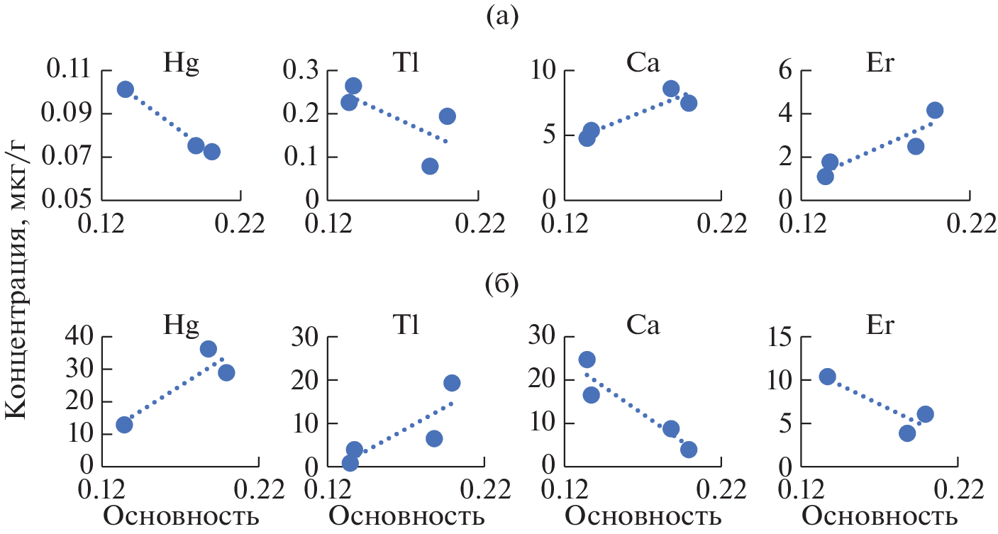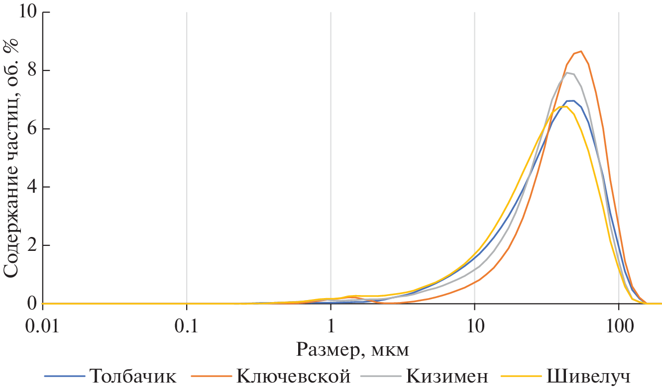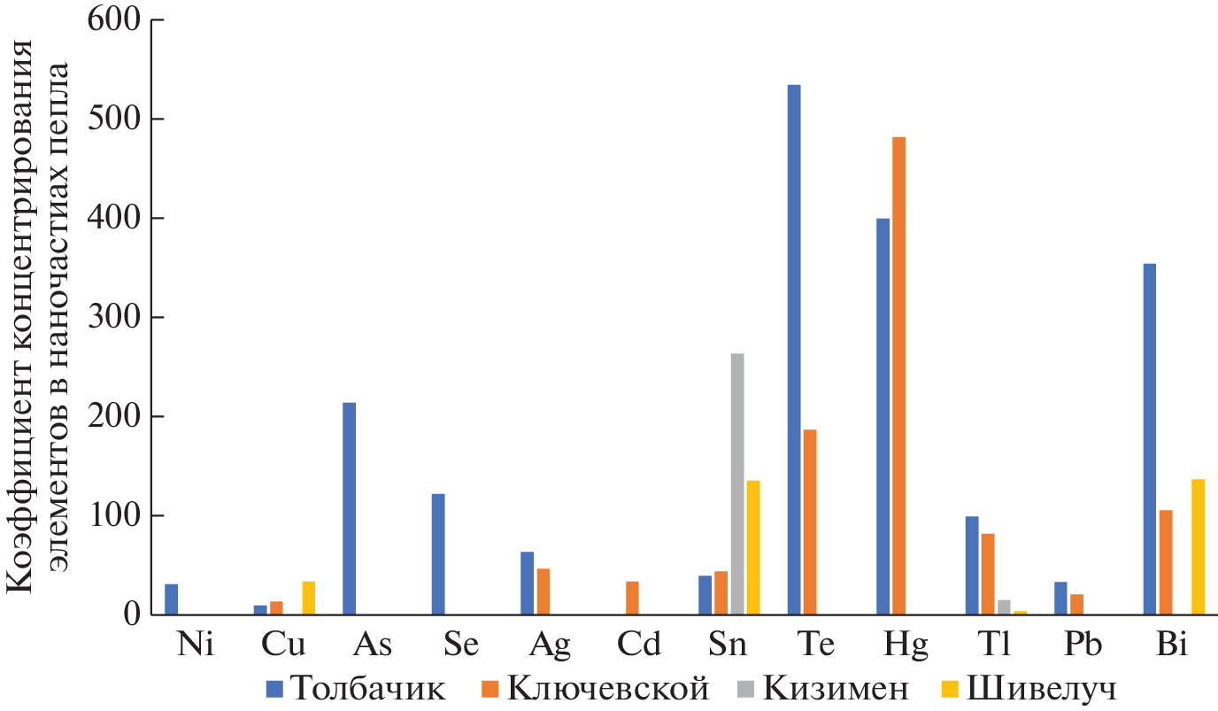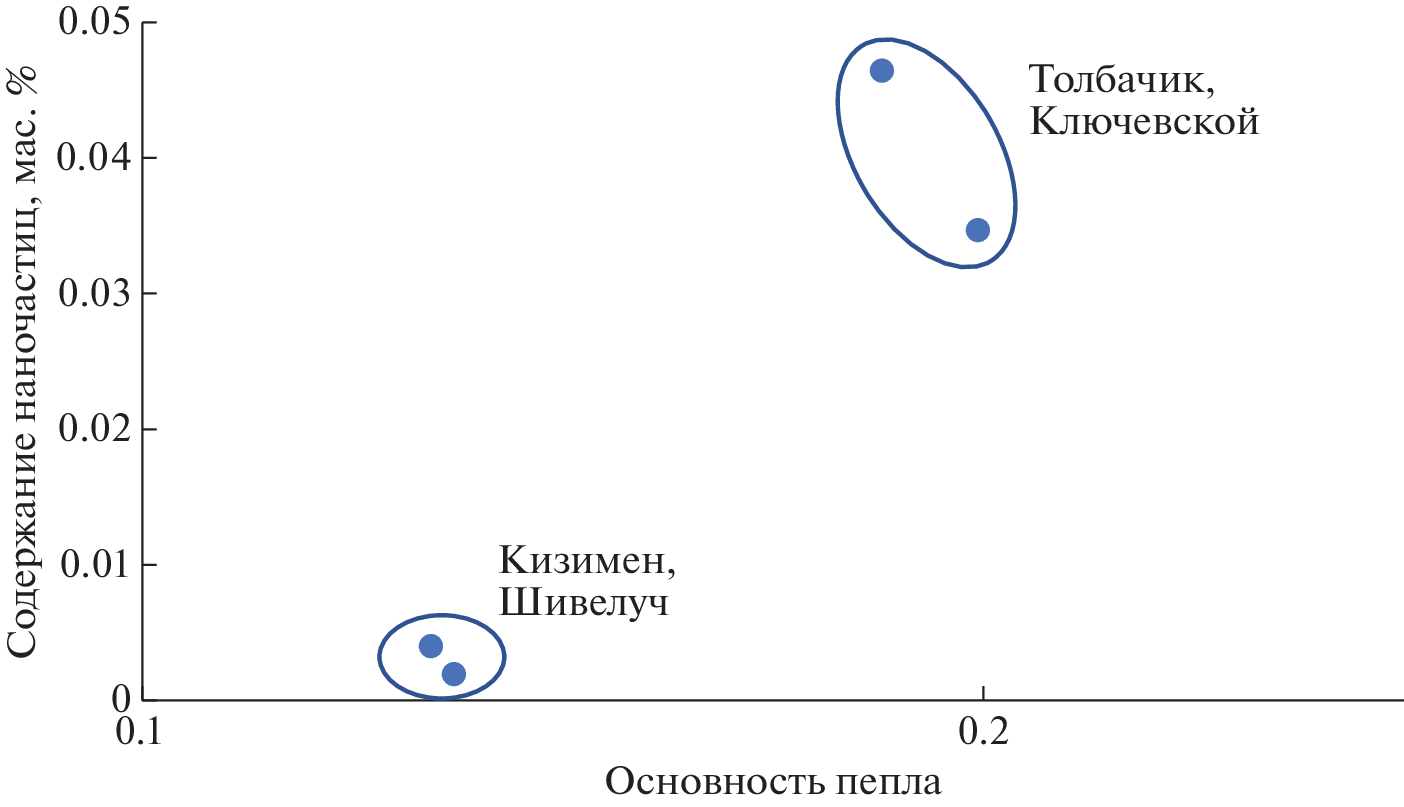 Obtained data on the composition and properties of ash nanoparticles from Klyuchevskoy, Tolbachik, Kizimen, and Shiveluch volcanoes (Kamchatka, Russia) are generalized. It has been shown that the concentration of toxic and potentially toxic metals and metalloids (Ni, Cu, As, Se, Ag, Cd, Sn, Te, Hg, Tl, Pb, Bi) in volcanic ash nanoparticles can be 10–535 times higher than their concentration in bulk polydisperse samples. The most volatile elements such as As, Sn, Te, Hg, Tl, and Bi have the highest concentration factors in the range of 100–535. Based on the data on single particle inductively coupled plasma mass spectrometry, it is assumed that the listed metals and metalloids are accumulated in the fraction of volcanic ash nanoparticles mainly through the condensation of these elements or their compounds from the gaseous phase and the formation of individual (single) nanophases with an average size in the range of 12–74 nm. It should be noted that approximately an order of magnitude less nanoparticles have been isolated from the acidic volcanic ashes of the Kizimen and Shiveluch volcanoes as compared to those of basic ashes of the Tolbachik and Klyuchevskoy volcanoes. This fact is inconsistent with published data showing that the fraction of fine ash is usually larger for acidic explosive eruptions compared to basaltic eruptions. The Pearson correlation coefficients between the basicity index of volcanic ash and the concentration of more than 50 elements in the ash and ash nanoparticles have been calculated. Some elements have a correlation coefficient |R| > 0.7, which, according to the Chaddock scale, indicates the high degree of correlation. It is noted that a number of elements have an opposite correlation between the basicity index of ash and the concentration of elements in ash and ash nanoparticles. For example, Hg and Tl content in ash have a negative correlation with basicity index, that is, their concentration decreases with increasing basicity index of the ash, whereas their concentrations in nanoparticles positively correlate with ash basicity index. The concentration of Ca, Ho, and Er in the ash increases with an increase in the ash basicity index, whereas ash nanoparticles show an opposite correlation. The revealed regularities are unexpected and confirm the unique features of nanostructures and raise new questions of nanogeochemistry.