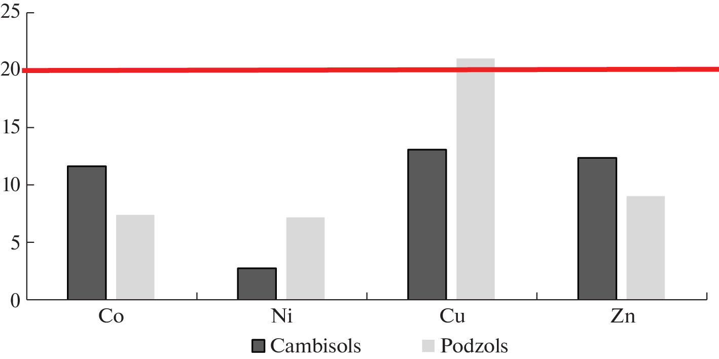 The article considers the distribution of mobile forms and bulk concentrations of Zn, Cu, Ni, Co in the genetic horizons of the studied soils at the studied area in the central part of the Valday Upland. The contents of easily soluble, exchangeable, and sum of potentially mobile forms of elements were determined by extraction method. It was found that in all genetic soil horizons, the bulk Zn content and the concentration of its mobile forms are higher than those of other elements, but Cu demonstrates the most intense migration. The predominant form of Cu migration is complexes with organic compounds. According to the calculated data of the extraction criterion (EC), the studied soils are background. The availability of Zn, Cu, and Co in the soils was estimated, which characterizes the potential reserves of elements as plant nutrients.