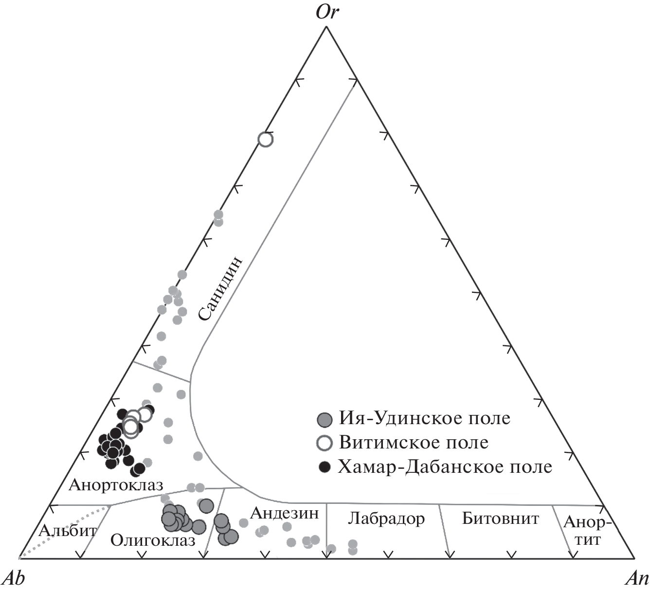 The paper discusses data on the elemental composition and 87Sr/86Sr, and δ18O isotopic ratios of feldspar megacrysts collected from lava flows, tuffs, and cinders of three volcanic fields in the Baikal rift system: Iya–Uda, Vitim, and Khamar-Daban, which are located within the early Precambrian, Riphean, and Paleozoic crustal blocks, respectively. Megacrysts are hosted in trachybasalts in the Iya–Uda and Khamar-Daban fields and in basanites in the Vitim field. Megacrysts belong to the following three compositional groups of minerals: (i) plagioclase in lavas of the Iya–Uda field, (ii) anorthoclase in lava flows, tuffs, and cinders of the Khamar-Daban and Vitim fields, and (iii) sanidine in the Vitim field. Elemental and isotope data suggest that megacrysts crystallized in volcanic chambers at different depth levels: anorthoclase crystallized from the most primitive magma with mantle-derived isotopic signatures at subcrustal depth levels, plagioclases were produced in deep crustal chambers during the interaction between mantle-derived magma and crustal rocks, and sanidine was captured from the upper crustal rocks.