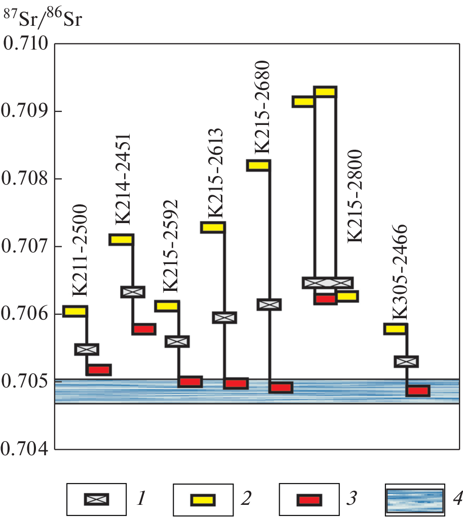 The potential of the stepwise dissolution analytical procedure to obtain chemostratigraphic and geochronological information is demonstrated by a case study of Riphean carbonate rocks of the Kamovskaya Group of the Baykit Uplift (Eastern Siberia). The procedures suggested for studying Rb–Sr and U–Pb systems in carbonate rocks included (1) selection of samples with the lowest 87Sr/86Sr ratio on the basis of preliminary Rb–Sr analysis of the collection using the routine procedure of bulk leaching in 0.1N CH3COOH; (2) detailed study of the Rb–Sr system in selected samples using two-step dissolution in 0.2N CH3COOH and derivation of L(Rb–Sr)1 and L(Rb–Sr)2 fractions; (3) analysis of Pb isotope composition of the selected samples to derive the preliminary value of their age; (4) detailed study of U–Pb system of carbonate rocks using the stepwise dissolution in 0.5N HBr, resulting in six dissolved fractions L(U–Pb)1–L(U–Pb)6 for each of the selected samples; and (5) a final calculation of the Pb–Pb age of the studied rocks, based on the results from the obtained fractions, with the exclusion from the calculation of the initial fractions of this dissolution containing epigenetically altered carbonate material. The values of the primary 87Sr/86Sr ratio in L(Rb–Sr)2 fractions of carbonate rocks of the Kamovskaya Group are as follows: limestone of the Madrinskaya Formation, 0.70490; dolomites of the Yurubchenskaya Formation, 0.70495–0.70503; and dolomites of the Kuyumbinskaya and Vingoldinskaya formations, 0.70580 and 0.70521, respectively. These values characterizing the least altered carbonate material correspond to 87Sr/86Sr ratios in the Early Archean and can be used for chemostratigraphic calculations. Taking into account the Rb–Sr data, the U–Pb age of the Yurubchenskaya Formation carbonate rocks dissolved in six steps was calculated, starting from L(U–Pb)3. The slope of the resulting isochron in the coordinates 206Pb/204Pb–207Pb/204Pb corresponds to 1501 ± 23 Ma, which supports the conclusion that the carbonate rocks of the lower part of the Kamovskaya Group of the Baykit Uplift were formed in the Early Riphean.