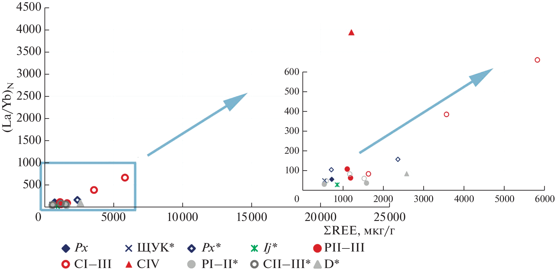 The Vuoriyarvi Paleozoic alkaline–ultramafic complex with carbonatites is made up of a great diversity of rocks with various ore mineralization. The paper presents data on the geochemistry of pyroxenites, phoscorites, and carbonatites from the Neskevara deposit of rare metals. The pyroxenites of the rare-metal deposit are significantly enriched in Nb, Ta, and Th relative to the primitive mantle and the primary alkaline–ultramafic melt composition calculated for the Kola alkaline province and are characterized by high Nb/Ta, Zr/Hf, and Th/U ratios of 29, 35, and 14, respectively. HFSE are maximally enriched in the phoscorites and carbonatites of stages II and III, with the highest concentrations of Nb (16 000 ppm), Th (2800 ppm), and Zr (4000 ppm) found in the calcite–tetraferriphlogopite phoscorites, in which pyrochlore crystallization on the liquidus was identified. The rocks of the carbonatite series are strongly enriched in LREE relative to carbonaceous chondrite. The calcite–dolomite carbonatites of the late magmatic–carbothermal stage show REE enrichment up to 25 800 ppm. The chondrite-normalized REE patterns and (La/Yb)N ratio indicate that REE were systematically more strongly fractionated in the sequence pyroxenite (70)—phoscorite (90)—calcite (540) and dolomite (3790) carbonatites The crystallization sequence of minerals in the rare-metal phoscorites and carbonatites of intermediate stages indicates that magnetite and pyrochlore crystallized nearly simultaneously. The crystallization temperatures of such associations are, according to data of the magnetite–ilmenite thermometer, lower than 500–600°C, at ∆NNO = –0.3 and + 1.5 and corresponded to the temperature at which the rare-metal ore mineralization of the main stage was formed.