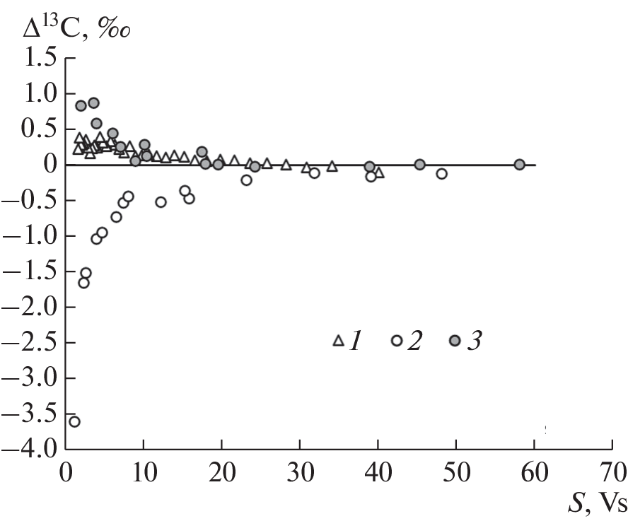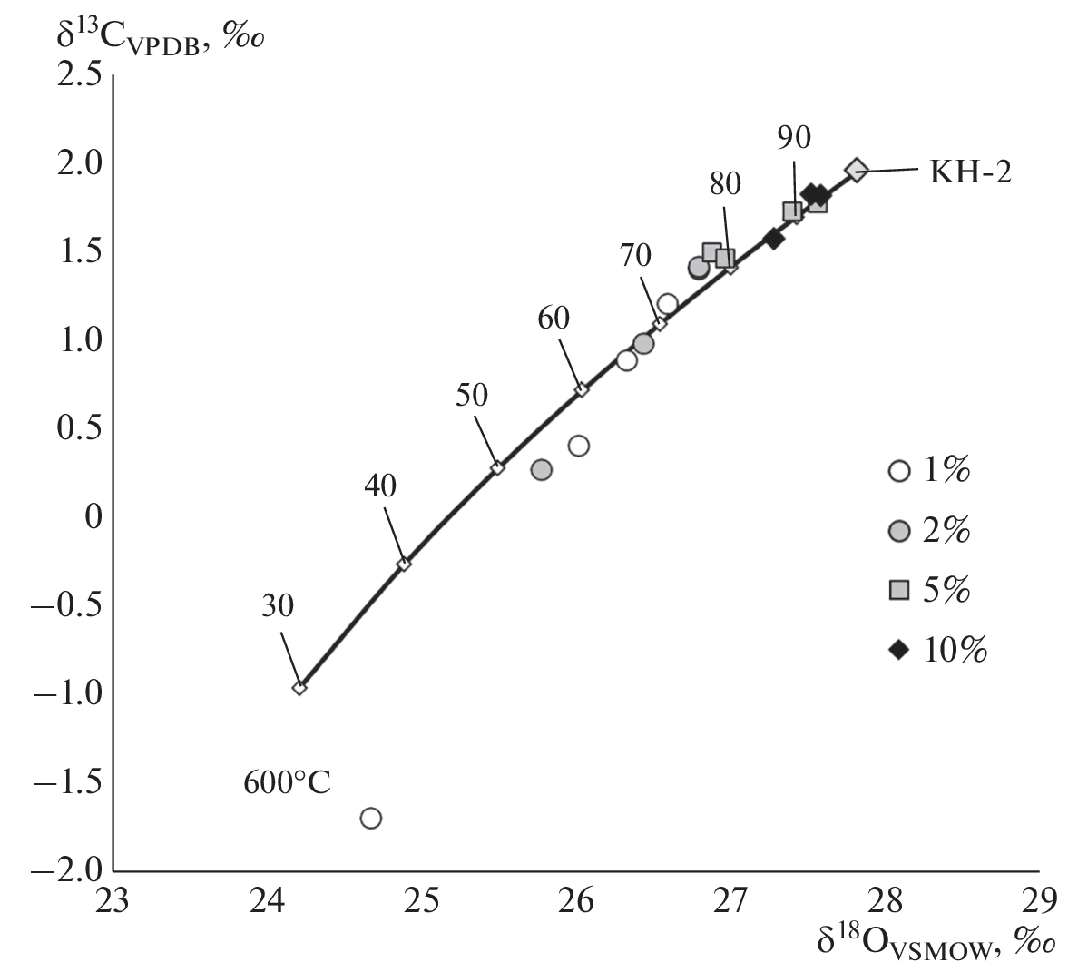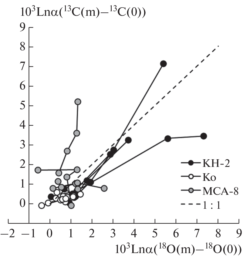 An experimental study of the main factors affecting the accuracy of oxygen and carbon isotopic analysis in carbonates dispersed in silicate matrix is carried out. Artificial 1, 2, 5, and 10% mixtures of quartz with carbonates with different isotopic parameters (KH-2, Ko, MCA-8) were analyzed by continuous flow isotope ratio mass spectrometry (CF IRMS). It is established that, in addition to the influence of the instrumental nonlinearity, the results are affected by two factors: trace amounts of CO2, constantly present in the system (the blank effect) and the presence of chemically neutral silicate particles (the matrix effect). The blank effect depends on the isotopic parameters of the sample and has very little influence on the estimated carbonate content in the rock. The matrix effect, on the contrary, strongly affects the estimated carbonate content, and produces the isotopic shift towards underestimated contents of heavy 13C and 18O isotopes. It is shown that this effect is related to the processes occurring near the CO2–acid–quartz interface, which are accompanied by kinetic fractionation of carbon and oxygen isotopes. Both effects are dependent on the amount of silicate matrix in the system and most clearly manifested during analysis of carbonate-poor rocks. When the carbonate content in the rock is about 1–2%, deviations from the true δ13C and δ18O values can reach the first ppm, while carbonate content obtained by chromatographic peak calibration can be underestimated by 20–40%.