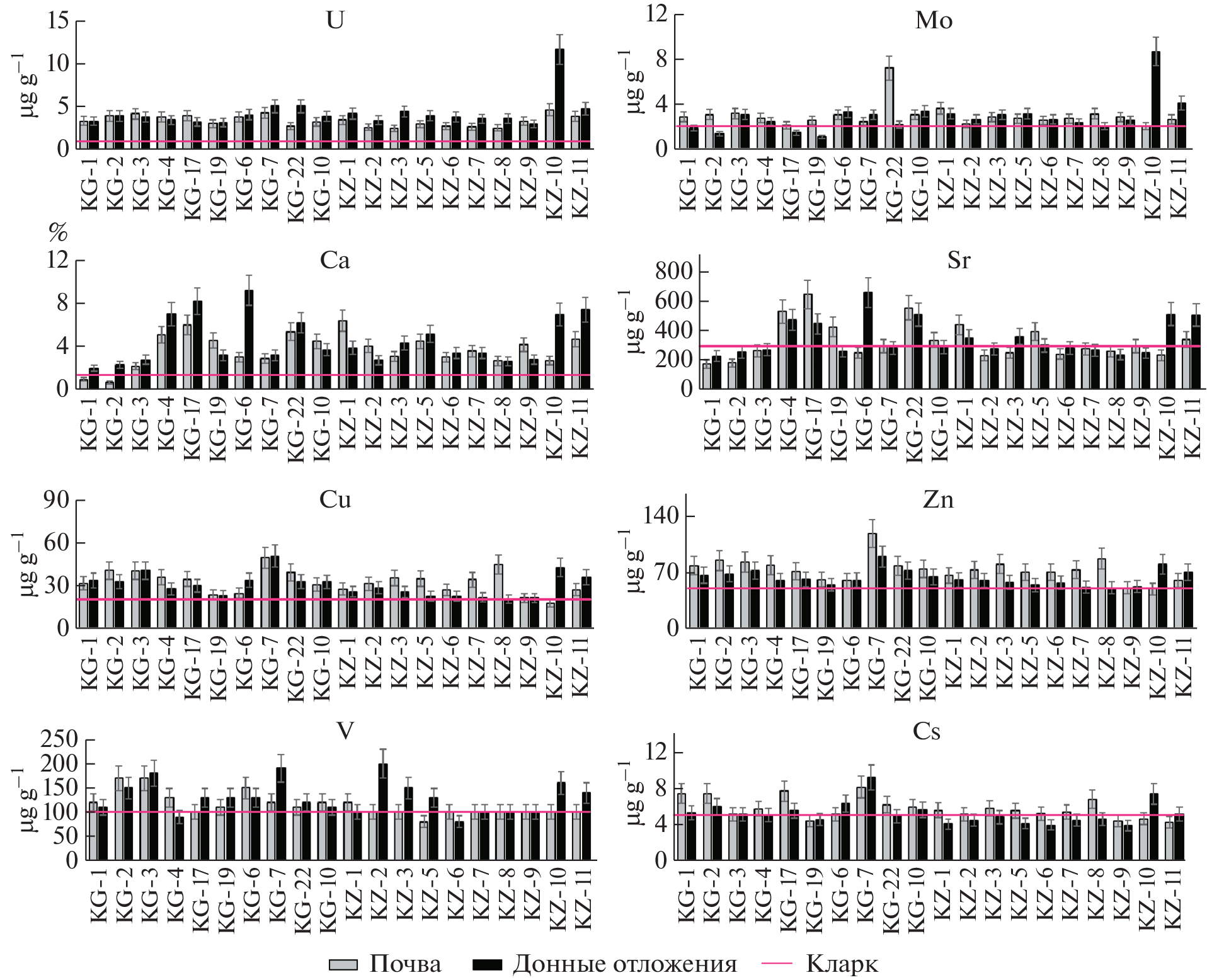The paper presents the results of researches of the concentration of chemical elements and natural radionuclide in the environmental objects of the Kara-Balta transboundary river basin (adjacent territories of Kyrgyzstan and Kazakhstan). The level of contamination of floodplain soils and bottom sediments of the Kara-Balta River with such chemical elements as U, Sb, As, Th, Pb, Sc, Co, Cu, Mo, Zn, V, Sr, Ba, Cs was established. Based on the calculated indicators of the contamination factor (CF), enrichment factor (EF), and index of geoaccumulation (Igeo), it was found that Sb, As and Br make the largest contribution to soil and bottom sediment pollution in the Kara-Balta water basin. At three checkpoints, an increased concentrations of U, B, Li, Sr, Mo were found in the water samples of the region’s reservoirs, which is related to the influence of the tailings of the Kara-Balta mining plant. The elevated concentrations of As, B, Ba, Co, Mn, Sb, V, and Zn were also established around the mouth of the Kara-Balta River, which flows into the Tasotkel reservoir (Kazakhstan). The results of the research can be explained by the fact that a significant part of the Kara-Balta transboundary river basin is located in the zone of a uranium natural–technogenic province.
