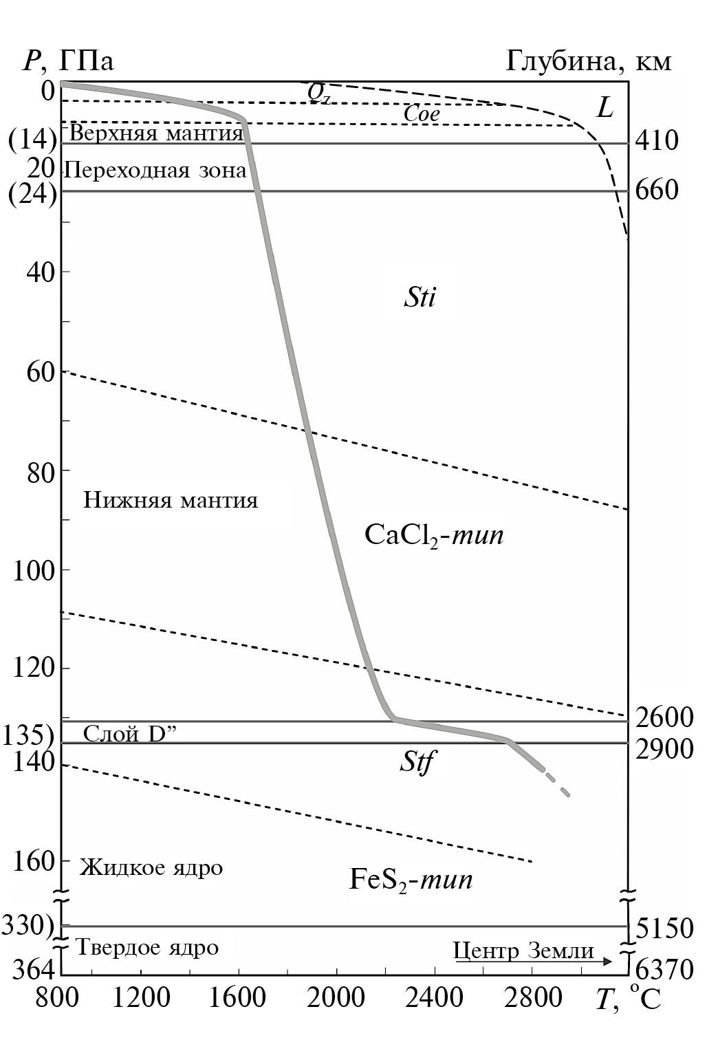На рис. 1 представлена РТ-диаграмма термодинамически стабильных полиморфных модификаций кремнезема до 350 ГПа и 3200 °C в полном разрезе Земли по экспериментальным данным с обозначением границ оболочек мантии и ядра, а также геотермы (рис. 1).