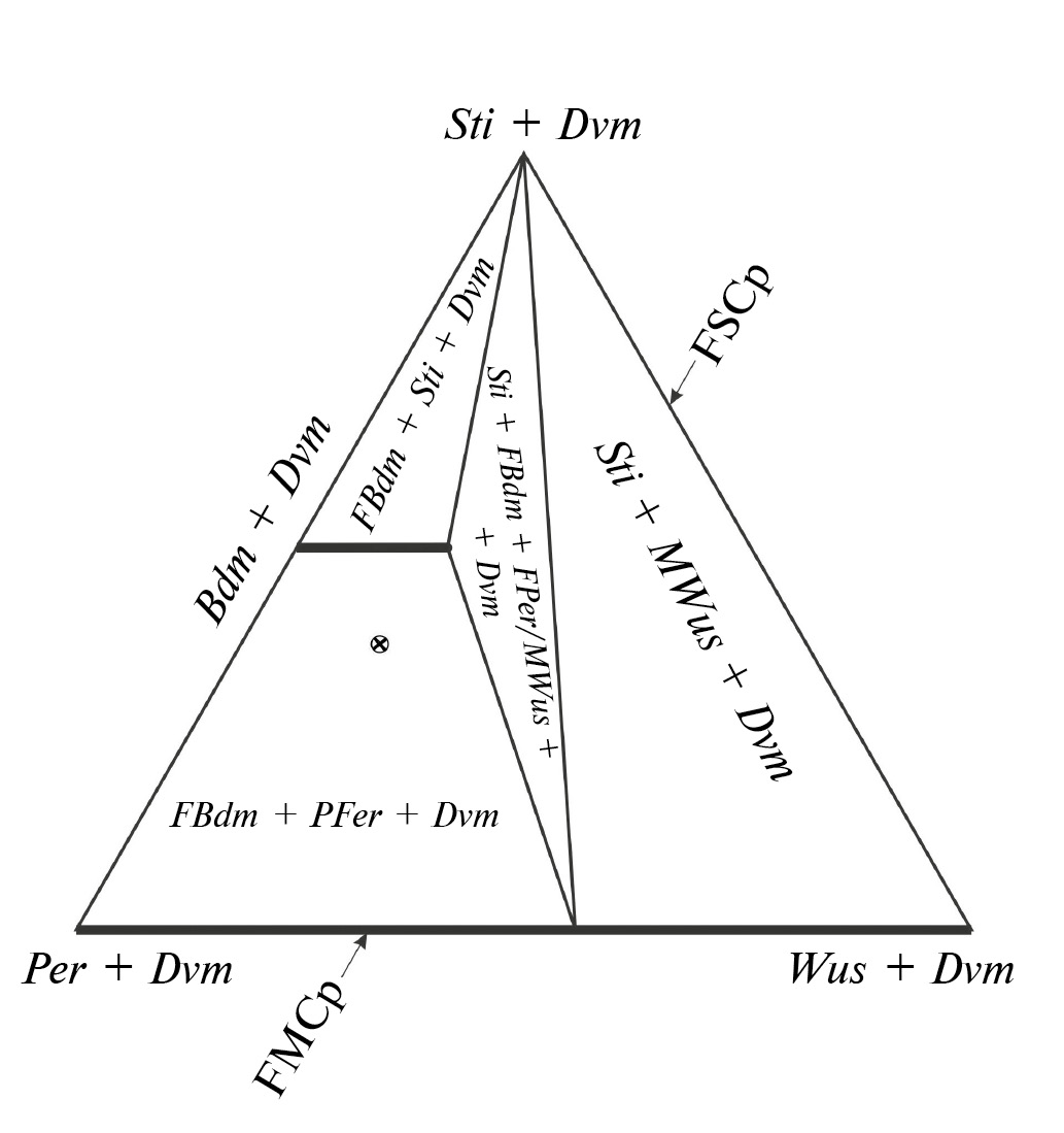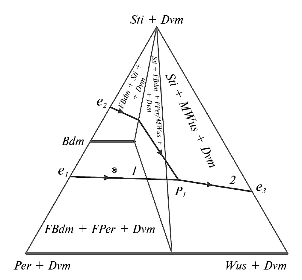 По экспериментальным данным, в условиях нижней мантии обогащенный железистым компонентом бриджменит испытывает перитектическую реакцию с расплавом, продуктами которой являются магнезиовюстит и стишовит. Фракционная эволюция магматизма последовательно контролируется следующей цепочкой элементов ликвидуса (рис. 6): от эвтектики е1 = L + FPer + FBrd + Dvm вдоль моновариантной котектики (1) = L + FPer + FBrd + Dvm до перитектики бриджменита с образованием стишовита Р1 = L+ FBrd+ FPer/MWus + Sti + Dvm, вдоль моновариантной котектики (2) = L + MWus + Sti + Dvm до эвтектики е3 = L + Wus + Sti + Dvm.