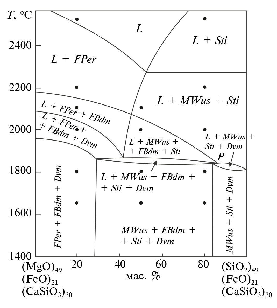 Рис. 5. Фазовые отношения при плавлении системы Per – Sti – Wus – Dvm в ее политермическом сечении (MgO)49(FeO)21(CaSiO3)30 – (SiO2)49(FeO)21(CaSiO3)30 при 26 ГПа. Экспериментальные точки показаны черными кружками. Р – перитектическая реакция FBdm и расплава L с образованием MWus и Sti. По данным (Spivak, Litvin, 2019).