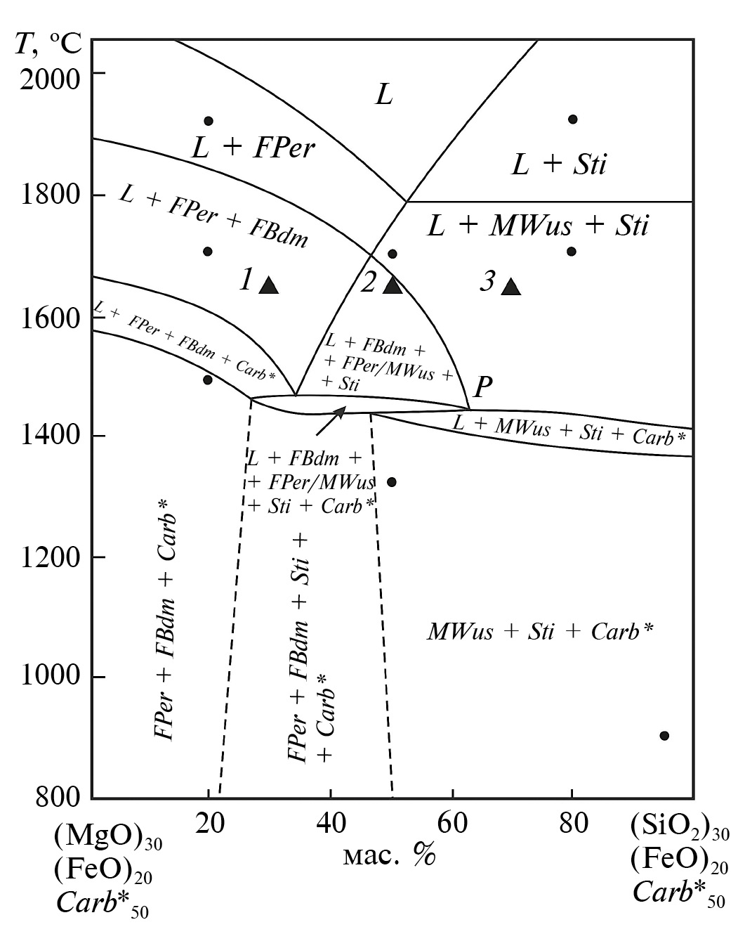 Рис. 7. Фазовые отношения при плавлении в политермическом сечении (MgO)30(FeO)20Carb*50 – (SiO2)30(FeO)20Carb*50 алмазообразующей системы нижней мантии Per – Wus – Sti – Carb* при 26 ГПа. Р – перитектическая точка L + FBdm + FPer/MWus + Sti + Carb*. Экспериментальные составы для кристаллизации алмаза отмечены черными треугольниками 1, 2 и 3 (источник углерода – графит). Стартовые составы для треугольных обозначений: 1 – (MgO)12.6 (FeO)12(SiO2)5.4Carb*30Gr40; 2 – (MgO)9(FeO)12(SiO2)9Carb*30 Gr40; 3 – (MgO)5.4(FeO)12(SiO2)12.6Carb*30Gr40. Gr – графит. По данным (Spivak, Litvin, 2019).