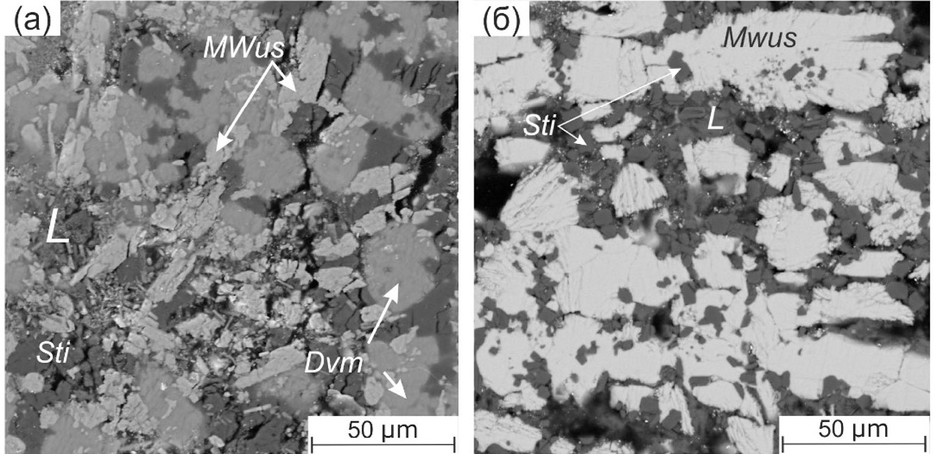 Рис. 1. Снимки СЭМ фаз базитовых ассоциаций переходной зоны L + MWus + Sti + Dvm при 1200 °С: (a) L + MWus + Sti при 1400 °С; (б) в результате закалки экспериментальных образцов с составами, соответствующими моновариантной котектике L+ MWus + Sti + Dvm при 20 ГПа. По данным (Литвин и др., 2021).