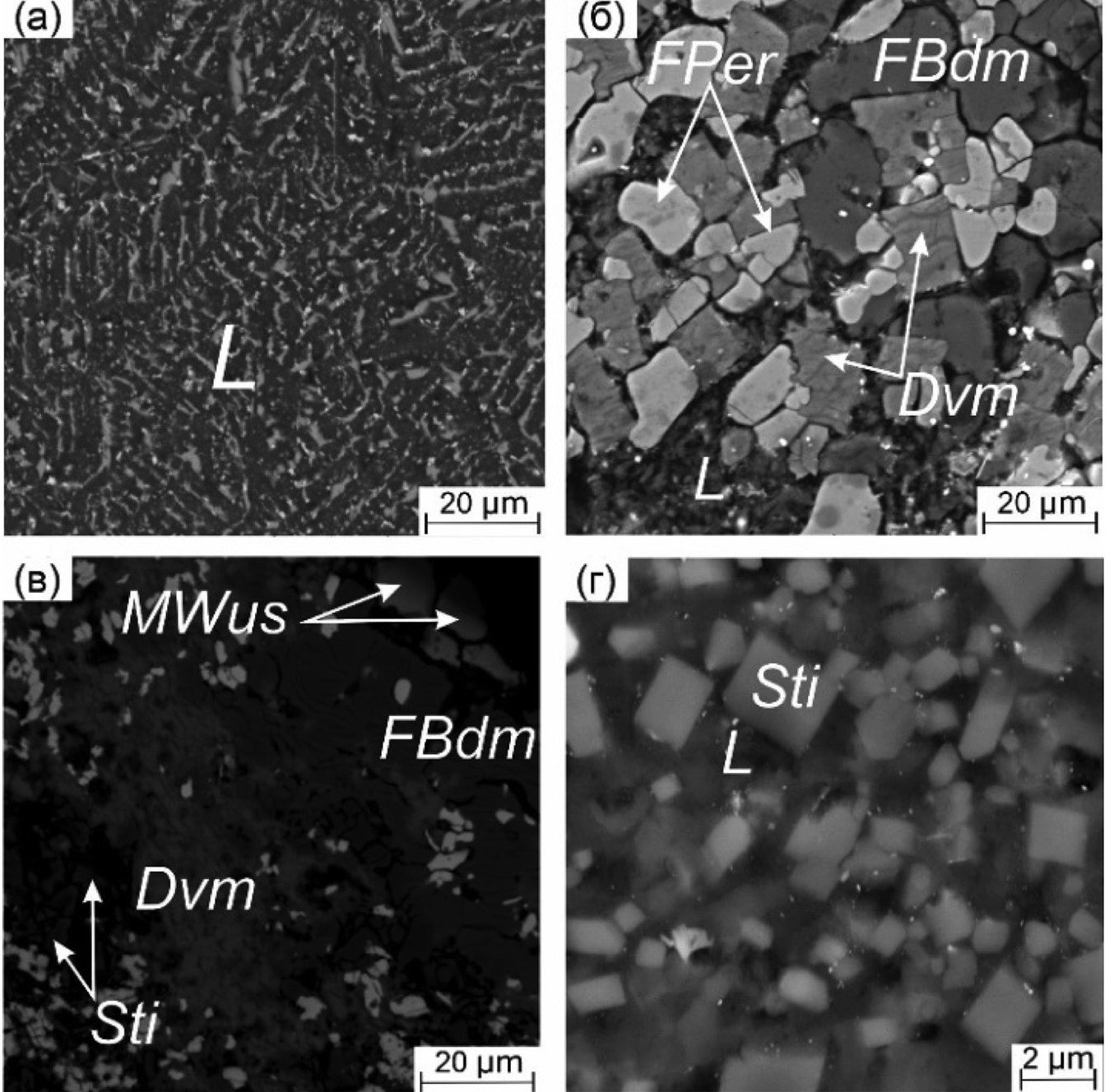 Рис. 2. Снимки СЭМ экспериментальных образцов при плавлении системыPer – Sti – Wus – Dvm при 26 ГПа после закалки, в том числе: (а) полный расплав L при 2500 °С, (б) фазовая ассоциация симплекса FPer + FBdm + Dvm при частичном плавлении (L) при 2000 °С, (в) фазовая ассоциация симплекса FBdm + MWus + Sti + Dvm с промежуточными продуктами перитектической реакции бриджменита при 1650 °С, (г) ликвидусный стишовит Sti в расплаве L при 2500 °С. По данным (Spivak, Litvin, 2019).