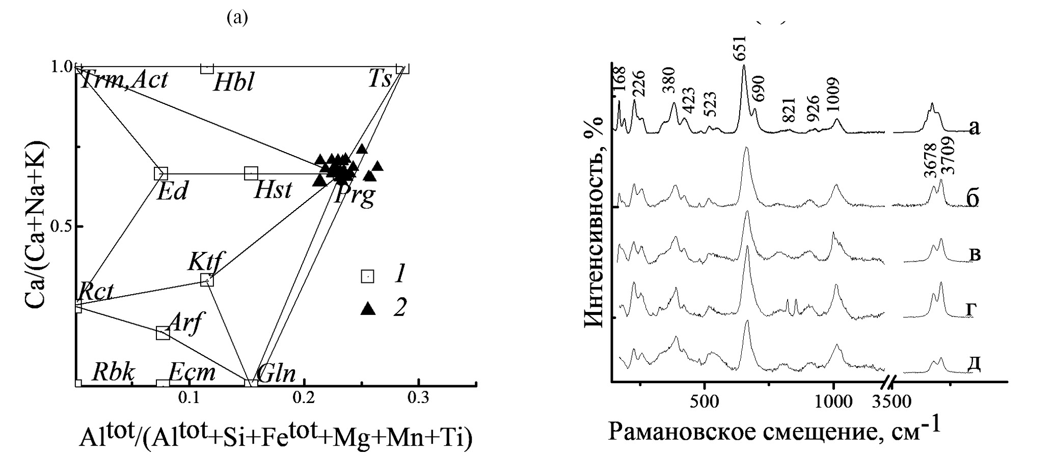 Кальциевые амфиболы являются типичными темноцветными минералами эффузивных пород. В общем виде амфиболы описываются формулой А(М4)2[(М2)2(М1)2(М3)][(Т1)4(Т2)4О22](ОН, F, Cl)2, где существуют 7 неэквивалентных катионных позиций. Магматические амфиболы – распространенные породообразующие минералы, отражающие наличие и состав летучих расплава. Из-за широкого спектра изоморфизма амфиболы продолжают оставаться слабоизученными твердыми растворами.