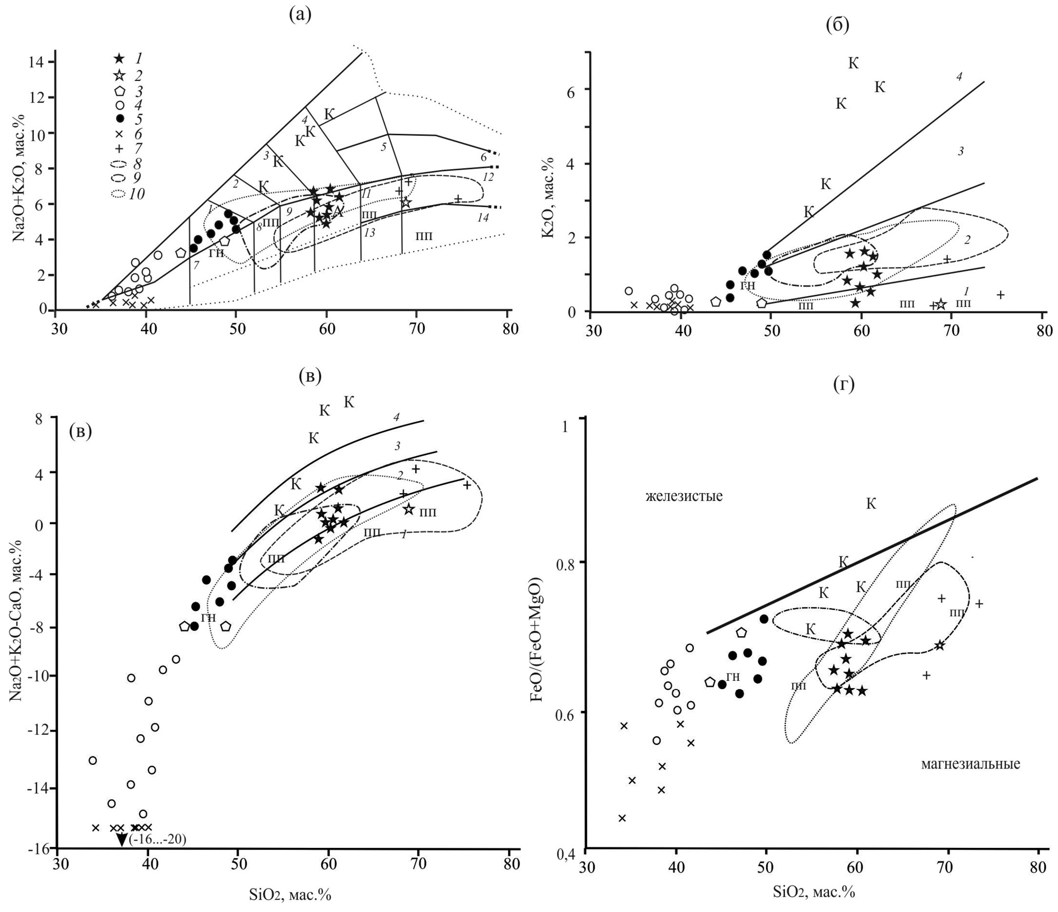 Рис. 2. Диаграммы Na2O+K2O – SiO2 (TAS) (Петрографический…, 2008) (а), K2O – SiO2 (Peccerillo, Taylor, 1976) (б), Na2O+K2O-СаО – SiO2 (Frost et al., 2001) (в) и FeOобщ/(FeOобщ+MgO) – SiO2 (Frost et al., 2001) (г) для пород Волковского массива и гранитоидов Платиноносного пояса Урала. 1–5 – Волковский массив, Центральный блок: 1 – кварцевый диорит, 2 – плагиогранит, 3 – габбро лабрадоровое, 4 – габбро оливиновое, 5 – монцогаббро. 6, 7 – Волковский массив, Южный блок: 6 – габбро оливиновое, 7 – гранитоиды жильные. 8–10 – гранитоиды Платиноносного пояса Урала: 8 – диориты массивов Денежкин Камень и Кумба, 9 – тоналиты и плагиограниты Тагило-Баранчинского и Сертыньинского массива, 10 – габбро и тоналиты Талтминского массива. Буквами обозначены составы пород: К– Кушвинского монцодиорит-сиенитового массива, ПП – Черноисточинского плагиогранитного массива, ГН – габбронориты Кумбы. 8 – по (Ефимов и др., 2010), 9, К, ПП, ГН – по (Ферштатер и др., 1984; Ферштатер, 2013), 9, 10 – по (Бочкарев, 1990; Шмелев, 2005). Арабскими цифрами обозначены поля составов: (а) монцогаббро (1), монцогаббродиорита (2), монцодиорита (3), монцонита (4), граносиенита (5), умеренно-щелочного гранита (6), габбро (7), габбродиорита (8), диорита (9), кварцевого диорита (10), гранодиорита (11), гранита (12), низкощелочного гранодиорита (13), низкощелочного гранита (14); (б) низко-К толеитовой серии (1), умеренно-К известково–щелочной серии (2), высоко-К известково–щелочной серии (3), субщелочной (шошонитовой) серии (4); (в) известковой серии (1), известково-щелочной серии (2), щелочно-известковой серии (3), щелочной серии (4).