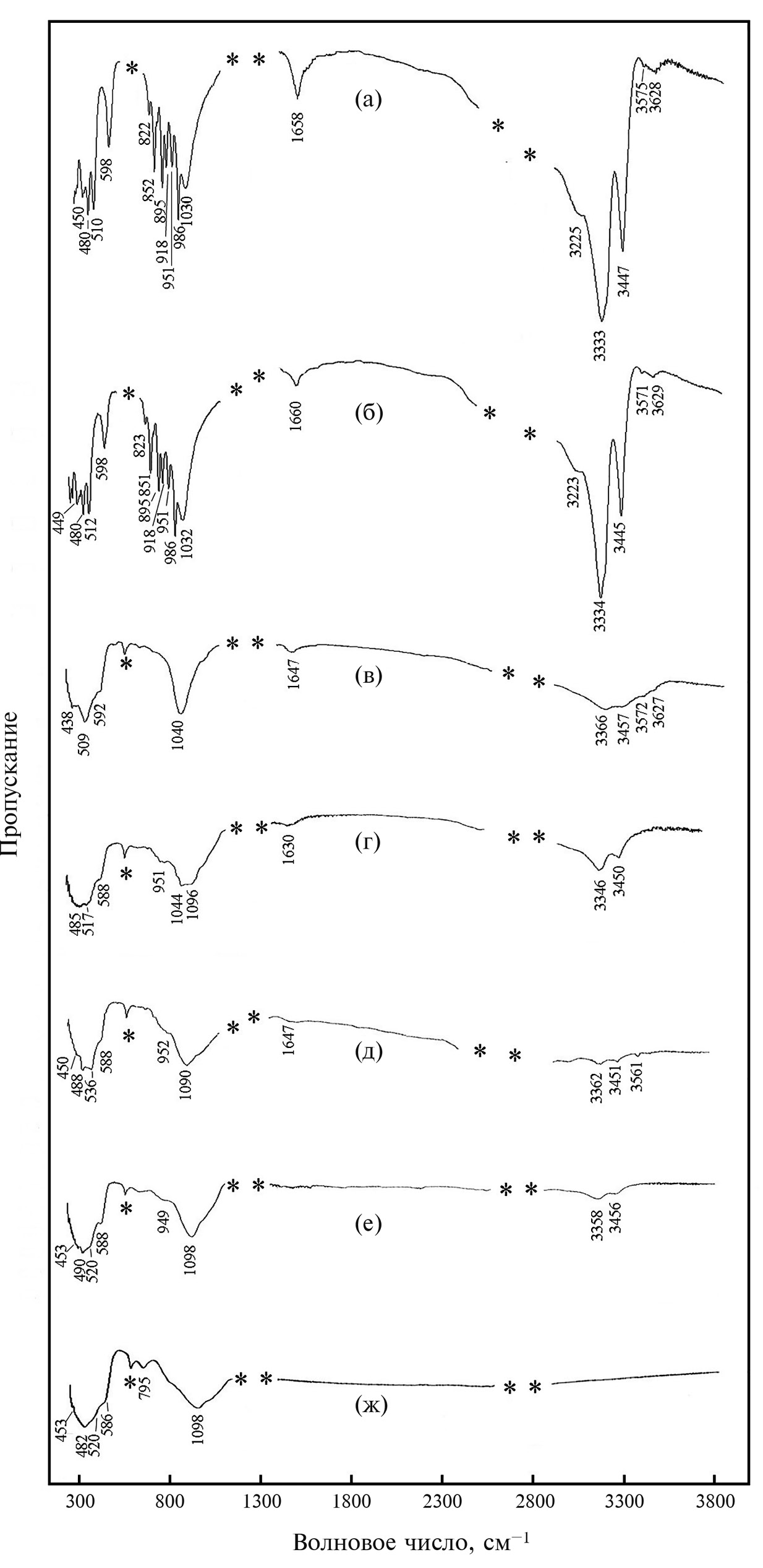 В спектре ИК поглощения продукта нагревания образца до 1000°С (рис. 5ж) зарегистрировано полное обезвоживание образца, присутствие тенорита и кристобалита. По данным порошковой рентгенографии в этом продукте разложения атакамита присутствуют ~85 мас. % тенорита и ~15 мас. % β-кристобалита (рис. 3в). Процентное содержание образовавшегося кристобалита было использовано для расчета количества примесного опала в исходном образце, исходя из предположения о наличии в опалах вулканического происхождения до ~4 мас. % Н2О по данным (Flőrke et al., 1982; Ilieva et al., 2007).