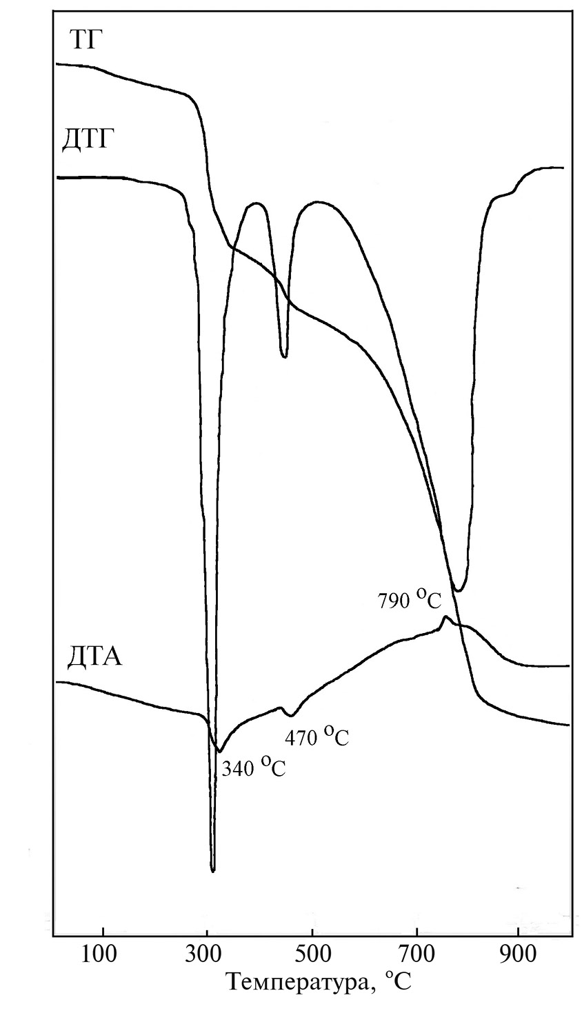 Рис. 6. Кривые нагревания изученного атакамита (скорость нагревания 20 град./мин, масса образца 19.2 мг).