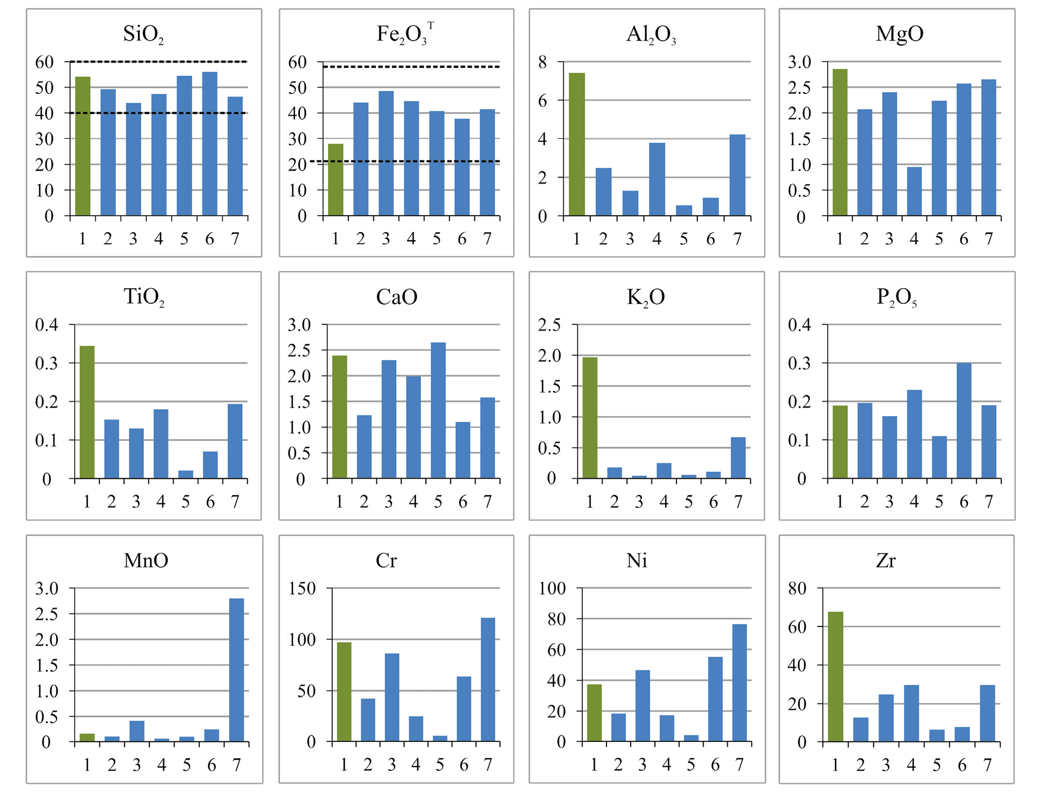 - Мезоархейские магнетитсодержащие кварциты, залегающие среди коматиит-базальтовой с дацитами толщи КЗП, характеризуются высоким содержанием SiO2 и Fe2O3T (их сумма – 78–99 мас. %), среди них обычны разности с содержанием SiO2–48.3–58.6 мас. %, а Fe2O3T – 21.34–33.82 мас. %, что позволяет рассматривать их как типичные BIF, сопоставимые с аналогами из других кратонов.
